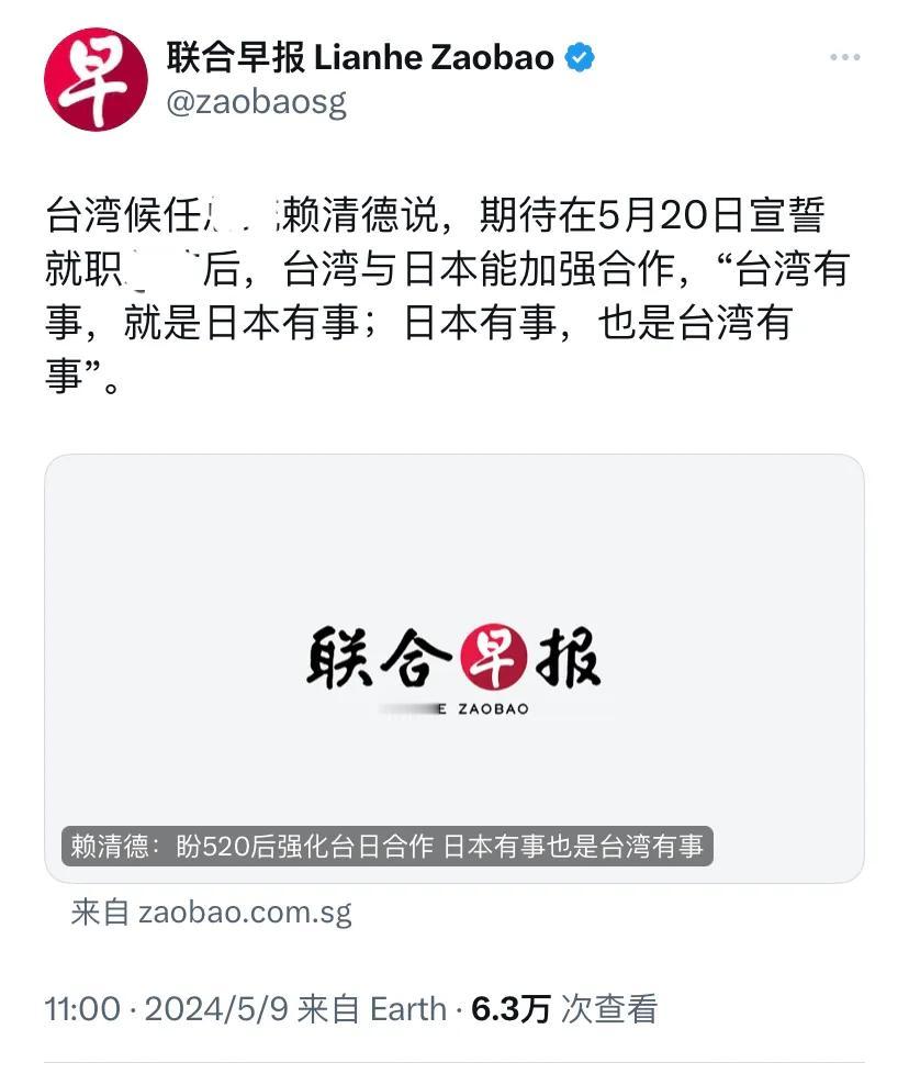 新加坡联合早报今天(5月9日)报道:“台湾候任地区领导人赖清德说,期待在5月20日宣誓就职地区领导人后,台湾与日本能加强合作,‘台湾有事,就是日本有事;日本有事,也是台湾有事’。”