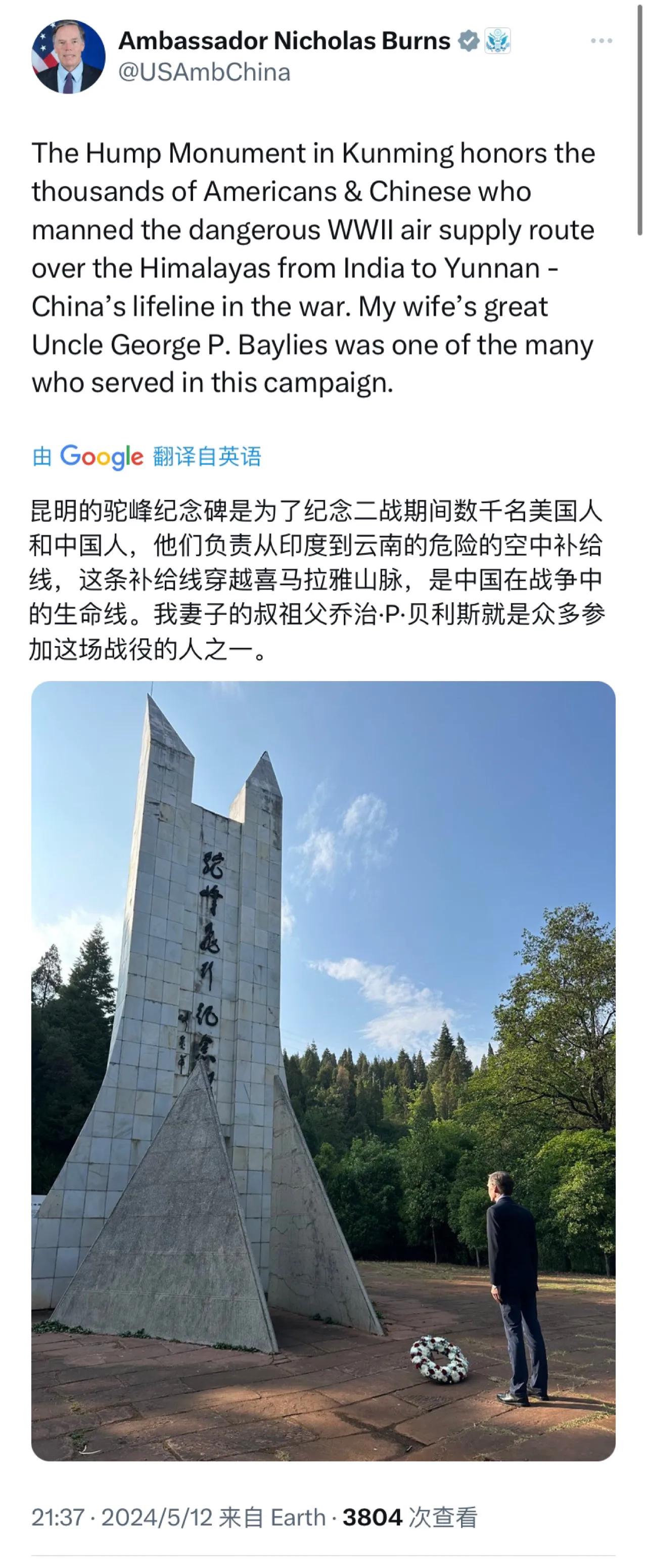 美国驻华大使伯恩斯今晚(5月12日晚)写道:“昆明的驼峰纪念碑是为了纪念二战期间数千名美国人和中国人,他们负责从印度到云南的危险的空中补给线,这条补给线穿越喜马拉雅山脉,是中国在战争中的生命线。我妻子的叔祖父乔治·P·贝利斯就是众多参加这场战役的人之一。”