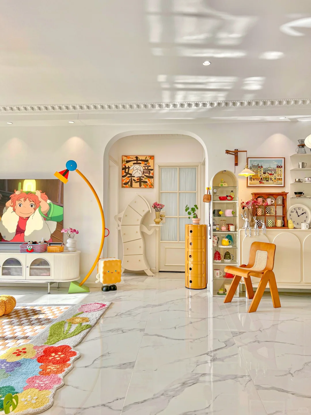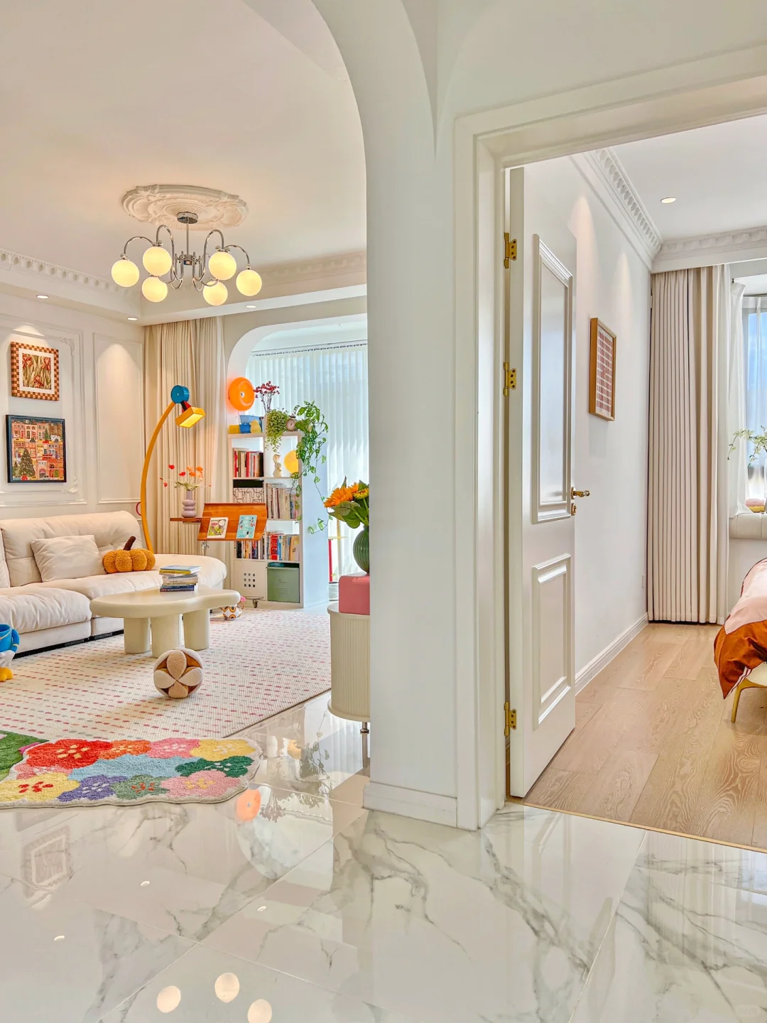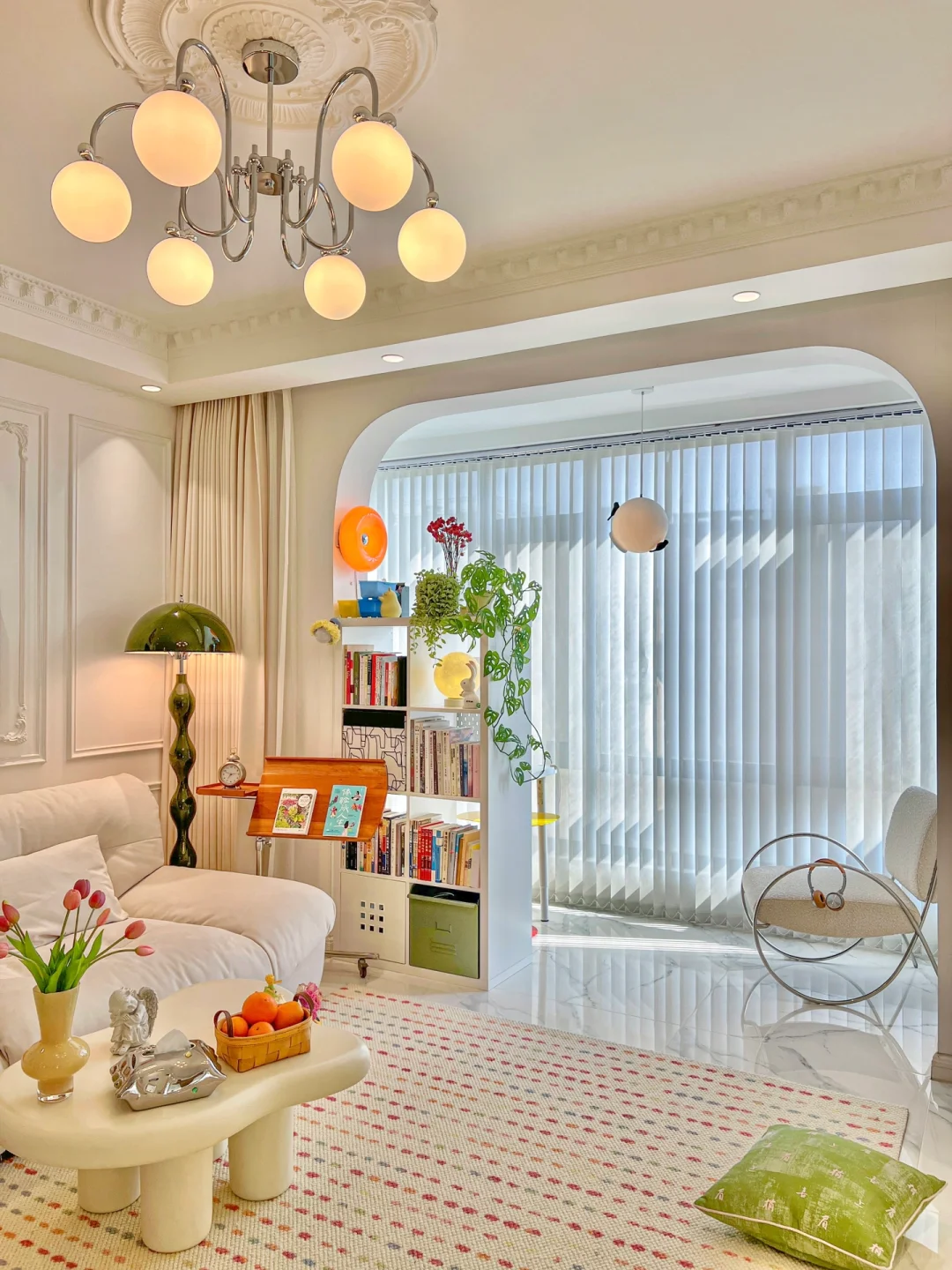 白色墙面耐看,不会过时,还显得空间开阔,不管是多彩的奶油风还是原木风都能轻松驾驭。而且白色和银色搭配更显高级感,就像客厅的蝴蝶结吊灯,精致典雅