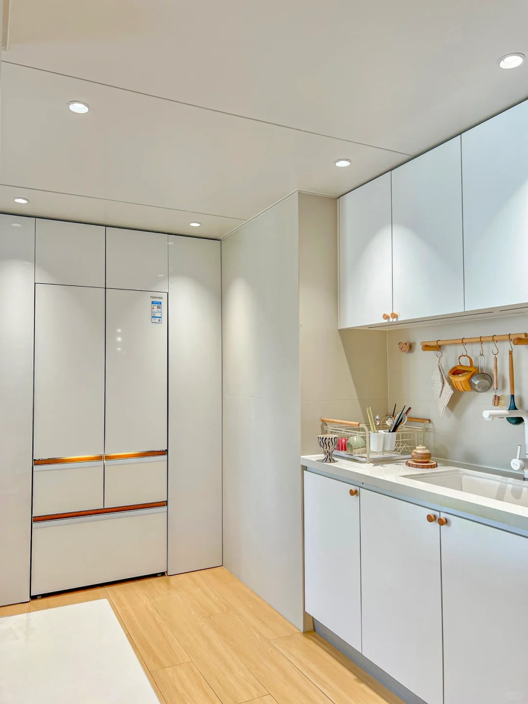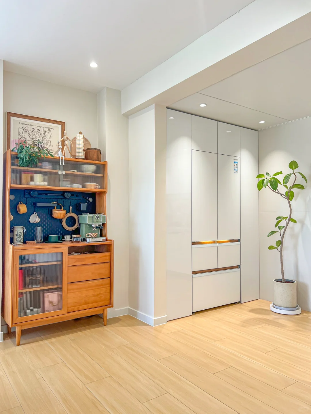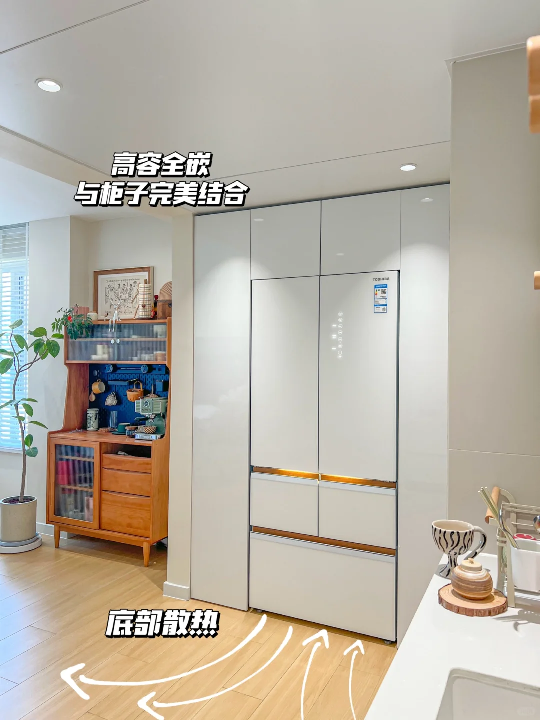 ▪️它的颜值很打动我,富士白冰箱门搭配抽屉木条纹,再配合感应氛围灯,简洁高级,很适合我家的原木风。况且冰箱高容全嵌可以和我家橱柜平齐,和橱柜0距离也真是治愈了我的强迫症😅