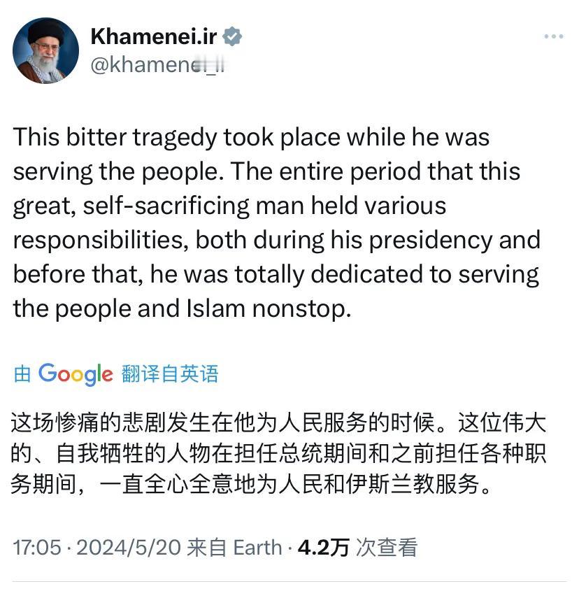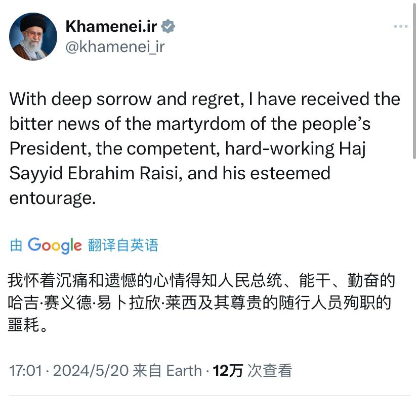 [机智]补充几句:“能干”、“勤奋”、“伟大的”、“自我牺牲的”和“为人民服务”,哈梅内伊给了伊朗总统莱西很高的评价。另外,作为伊朗最高领袖,哈梅内伊非常谨慎。1989年接替去世的宗教领袖霍梅尼成为伊朗最高领袖以来,哈梅内伊从来都没有出国访问,哪怕是周边的友好国家。35年不出国访问,让美国和以色列没有太多对哈梅内伊下手的机会。
