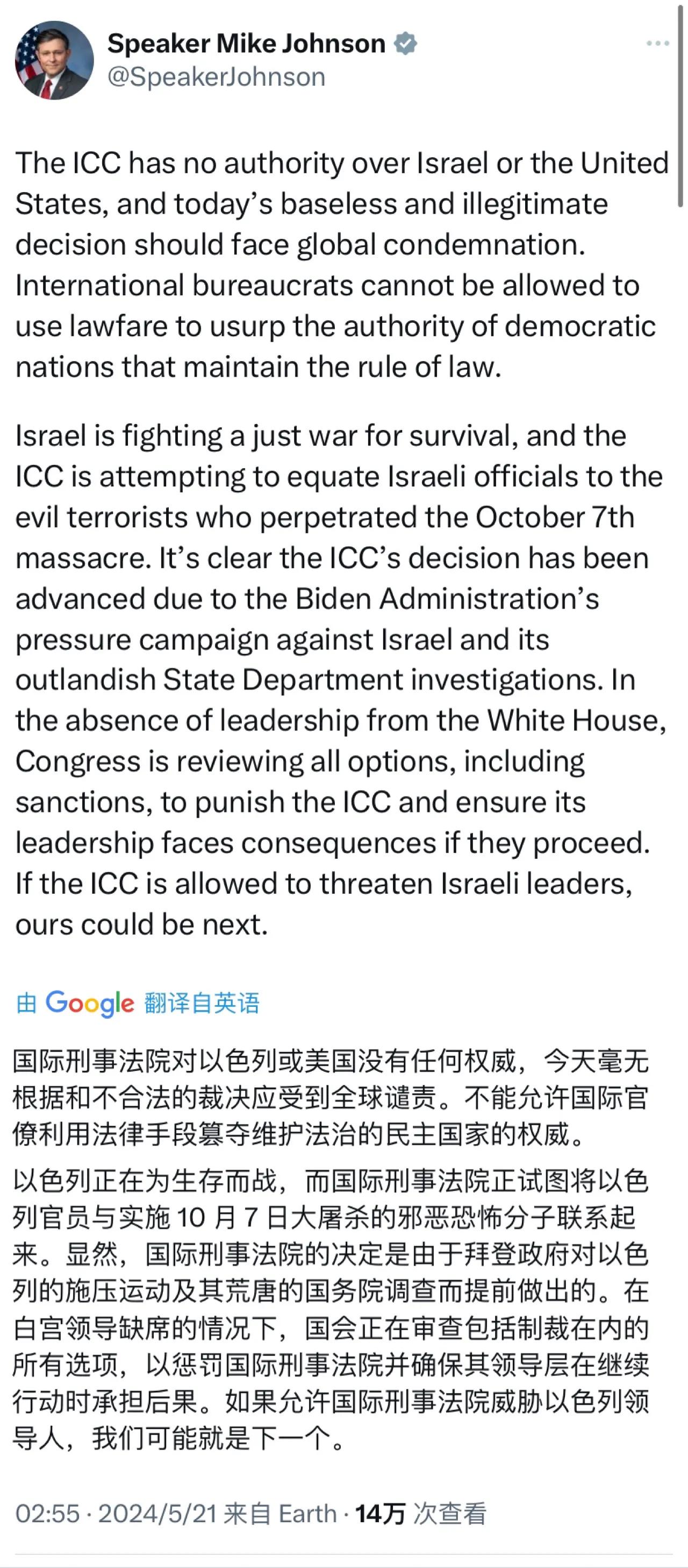 美国国会众议长迈克·约翰逊今天(北京时间5月21日)写道:“国际刑事法院对以色列或美国没有任何权威,今天毫无根据和不合法的裁决应受到全球谴责。不能允许国际官僚利用法律手段篡夺维护法治的民主国家的权威。