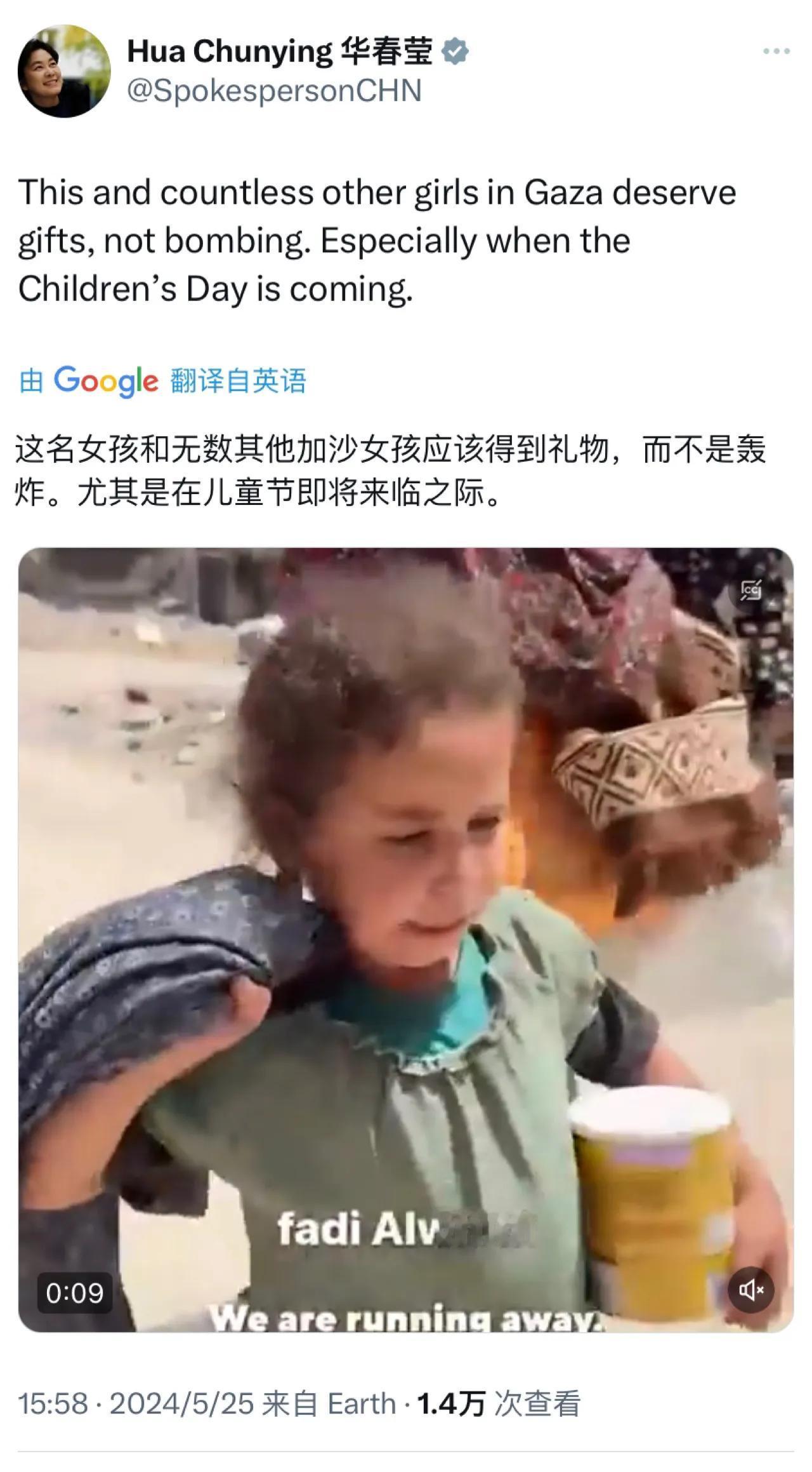 外交部部长助理华春莹今天(5月25日)写道:“这名女孩和无数其他加沙女孩应该得到礼物,而不是轰炸。尤其是在儿童节即将来临之际。”