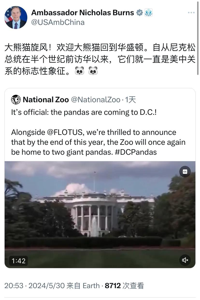 美国驻华大使伯恩斯今晚(5月30日晚)写道:“大熊猫旋风!欢迎大熊猫回到华盛顿。自从尼克松总统在半个世纪前访华以来,它们就一直是美中关系的标志性象征。🐼 🐼”