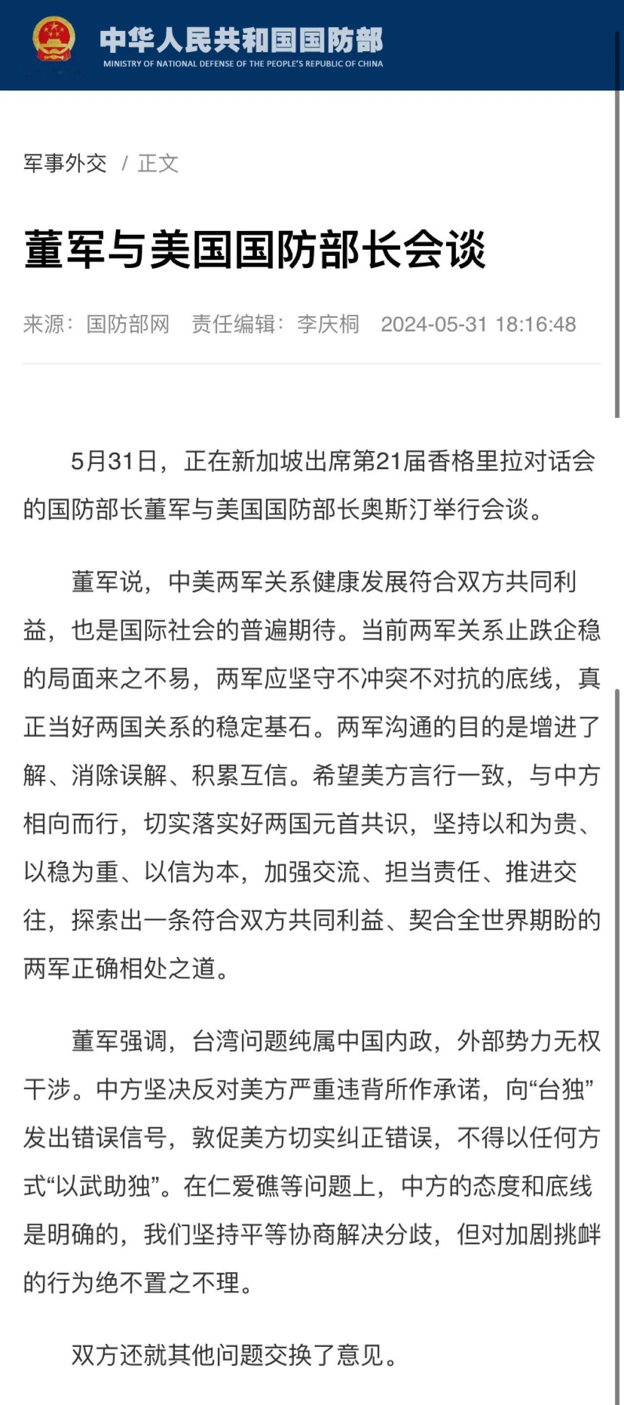 [机智]评几句:中美防长的这次会谈持续了75分钟,超过了预期。这是奥斯汀和董军部长之间的第一次面对面会晤。在两国防长举行会晤之后,美军也不会放弃在台海、南海对中国继续实施挑衅和干涉,我方也将坚决捍卫国家主权和国家尊严。这次会晤最大的意义,还是会晤本身,中美国防部长能够坐下来“坦诚地”交换意见。