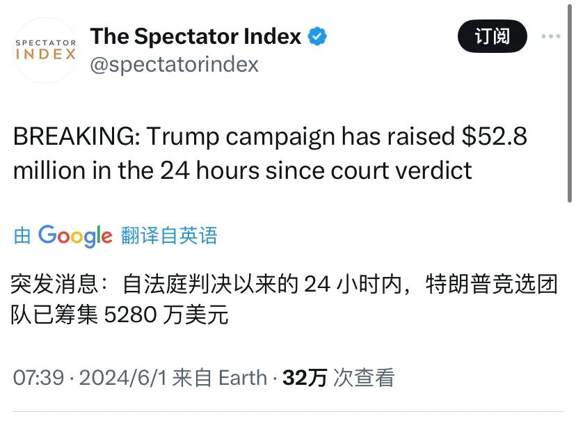 突发消息:自法庭判决以来的 24 小时内,特朗普竞选团队已筹集 5280 万美元。