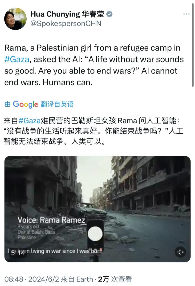 外交部副部长华春莹今天(6月2日)写道:“来自加沙难民营的巴勒斯坦女孩 Rama 问人工智能:‘没有战争的生活听起来真好。你能结束战争吗?’人工智能无法结束战争。人类可以。”