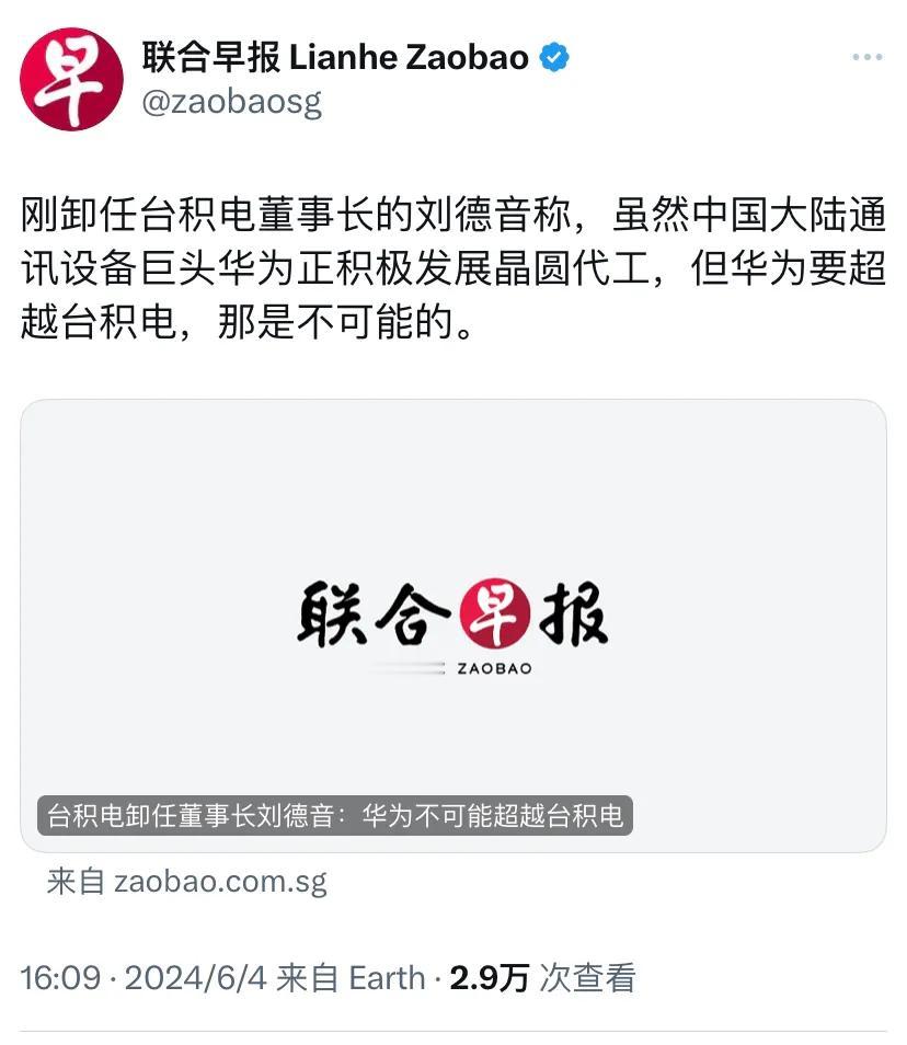 新加坡联合早报今天(6月4日)报道:“刚卸任台积电董事长的刘德音称,虽然中国大陆通讯设备巨头华为正积极发展晶圆代工,但华为要超越台积电,那是不可能的。”