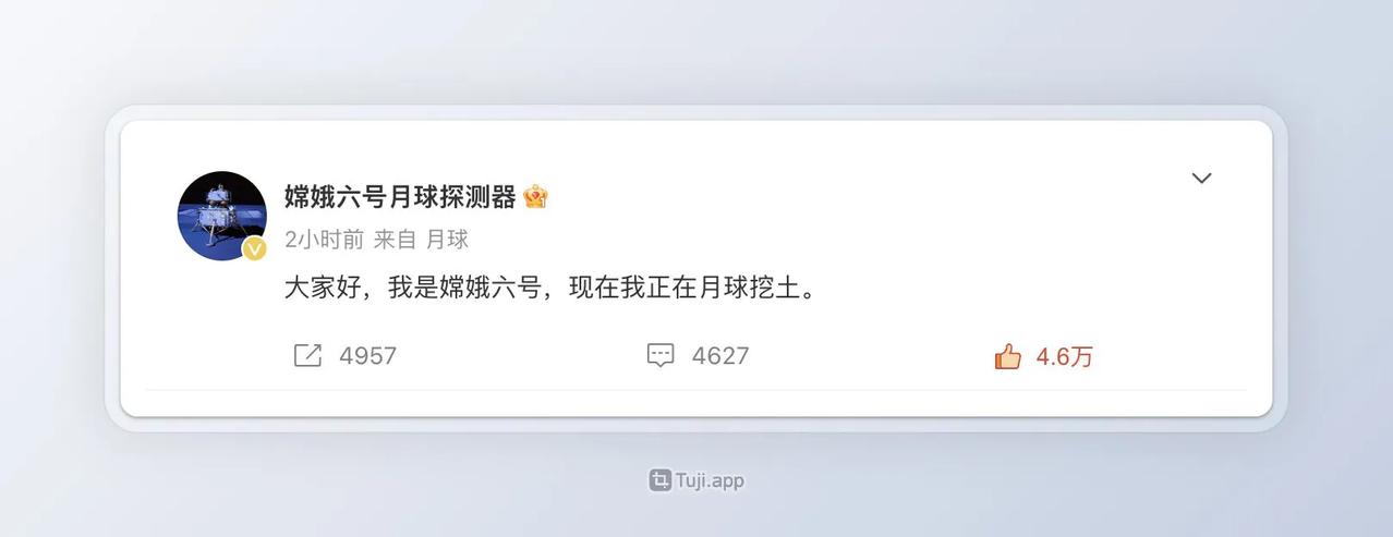 外交部副部长华春莹今天(6月4日)写道:“任务圆满完成! 嫦娥六号完成快速智能采样工作,首次在月球背面展示中国国旗🇨🇳成功从月球表面升空。人类探月史上史无前例的壮举!”