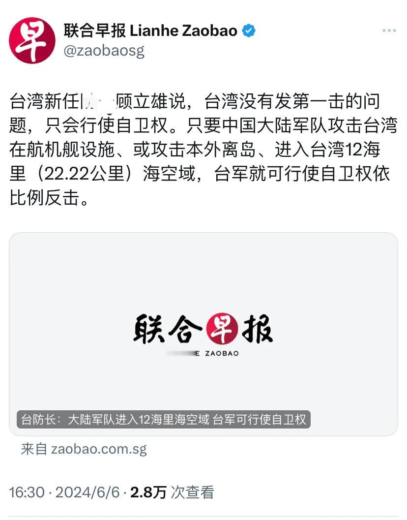 新加坡联合早报今天(6月6日)报道:“ 台湾新任防务部门负责人顾立雄说,台湾没有发第一击的问题,只会行使自卫权。只要中国大陆军队攻击台湾在航机舰设施、或攻击本外离岛、进入台湾12海里(22.22公里)海空域,台军就可行使自卫权依比例反击。”