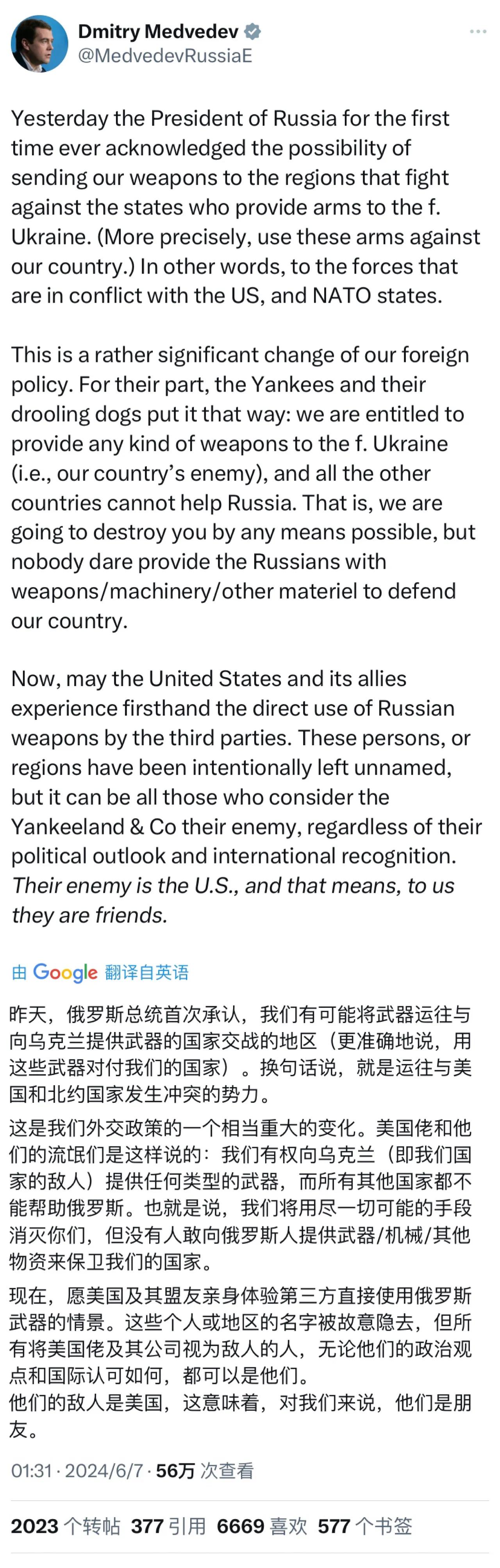 梅德韦杰夫今天(北京时间6月7日)写道:“昨天,俄罗斯总统首次承认,我们有可能将武器运往与向乌克兰提供武器的国家交战的地区(更准确地说,用这些武器对付我们的国家)。换句话说,就是运往与美国和北约国家发生冲突的势力……他们的敌人是美国,这意味着,对我们来说,他们是朋友。”(全文见图二)