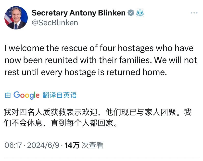 美国国务卿布林肯刚刚(北京时间6月9日6:17)写道:“我对四名人质获救表示欢迎,他们现已与家人团聚。我们不会休息,直到每个人都回家。”