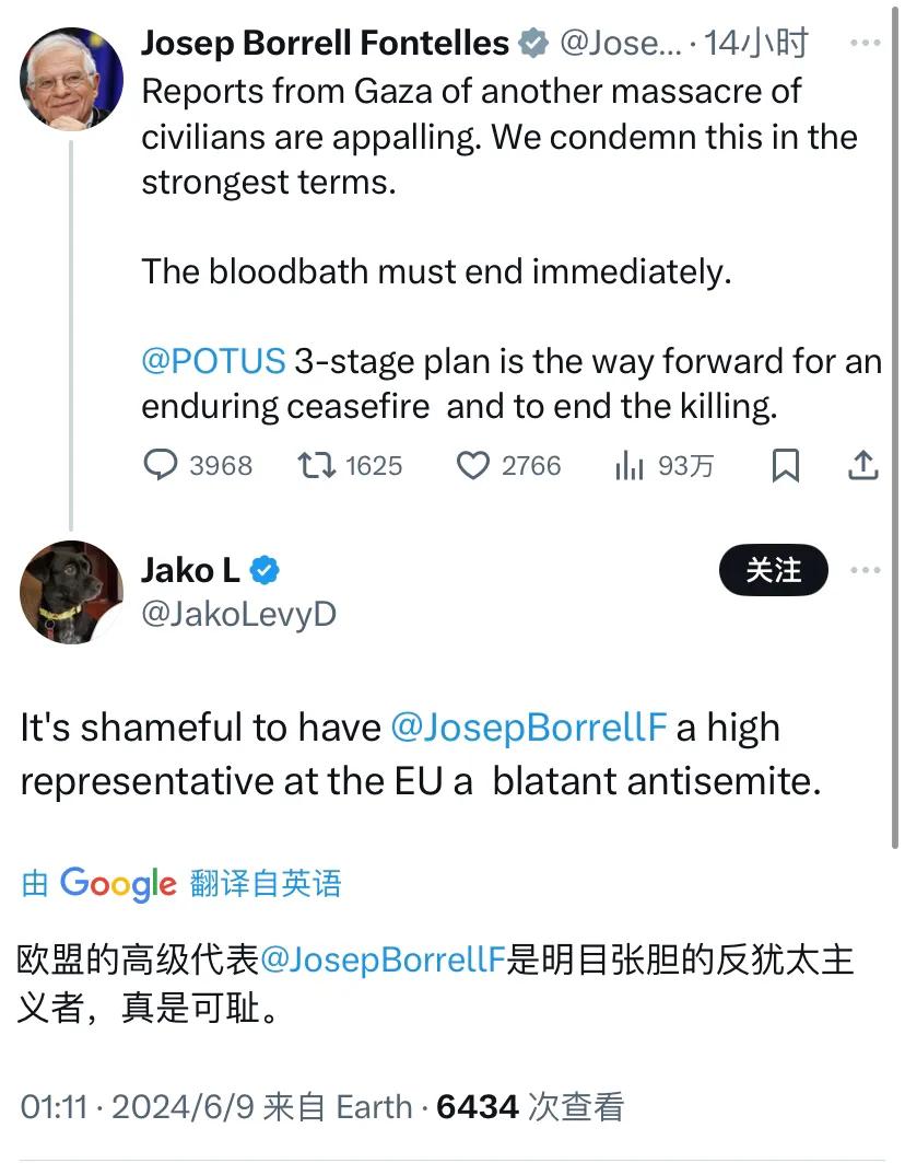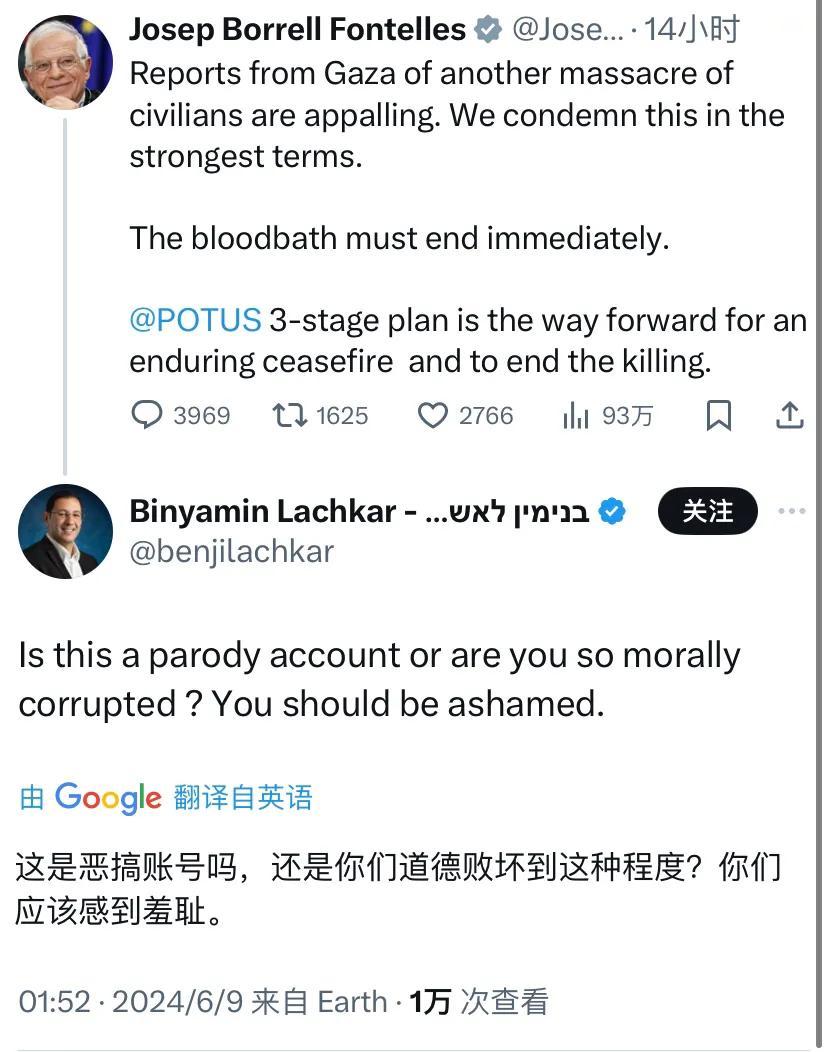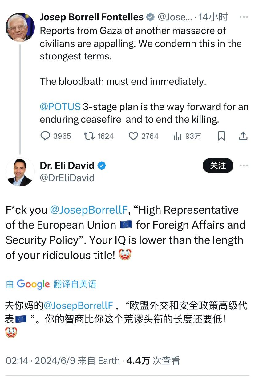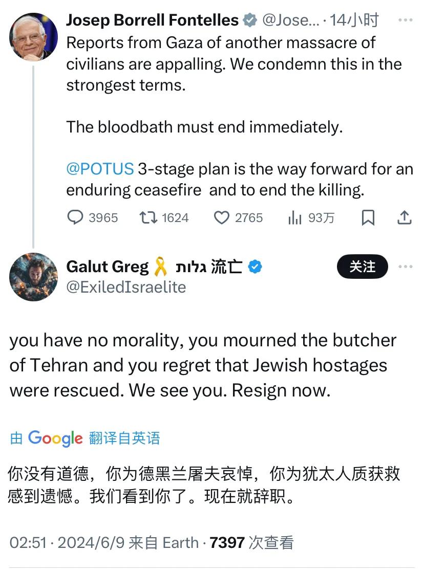 [机智]评几句:在博雷利的评论区,大多数网民都在用恶毒的语言谩骂他,指责博雷利必须下台,或者抨击博雷利不配成为欧盟外交与安全事务的高级代表。博雷利写道“我们对此予以最强烈谴责”,但是似乎博雷利是欧盟中唯一一位有勇气谴责暴行的高级官员。解救4名以色列人质是个好消息,但是以色列的空袭导致巴勒斯坦死亡210人,不该谴责吗?这210人都是绑架以色列人质的哈马斯?