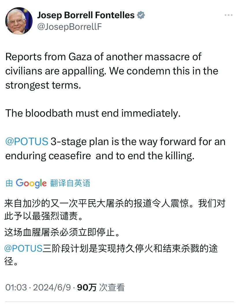 欧盟外交与安全事务高级代表博雷利今天(北京时间6月9日)写道:“来自加沙的又一次平民大屠杀的报道令人震惊。我们对此予以最强烈谴责。这场血腥屠杀必须立即停止。美国总统拜登的三阶段计划是实现持久停火和结束杀戮的途径。”