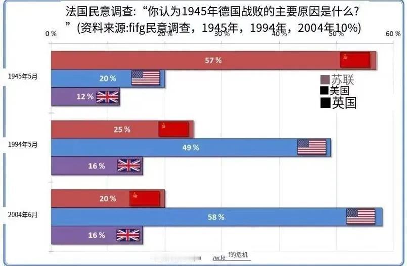 到了2004年6月份,20%的法国人认为是苏联打败了德国,58%的法国人认为是美国打败了德国。
