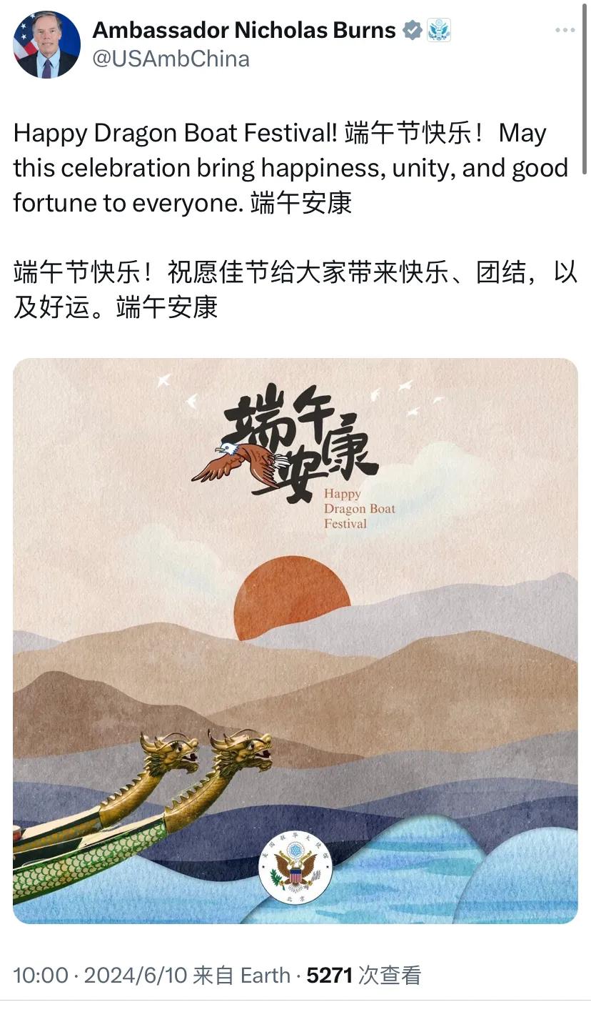 美国驻华大使伯恩斯今天(6月10日)用中英双语写道:“端午节快乐!祝愿佳节给大家带来快乐、团结,以及好运。端午安康”