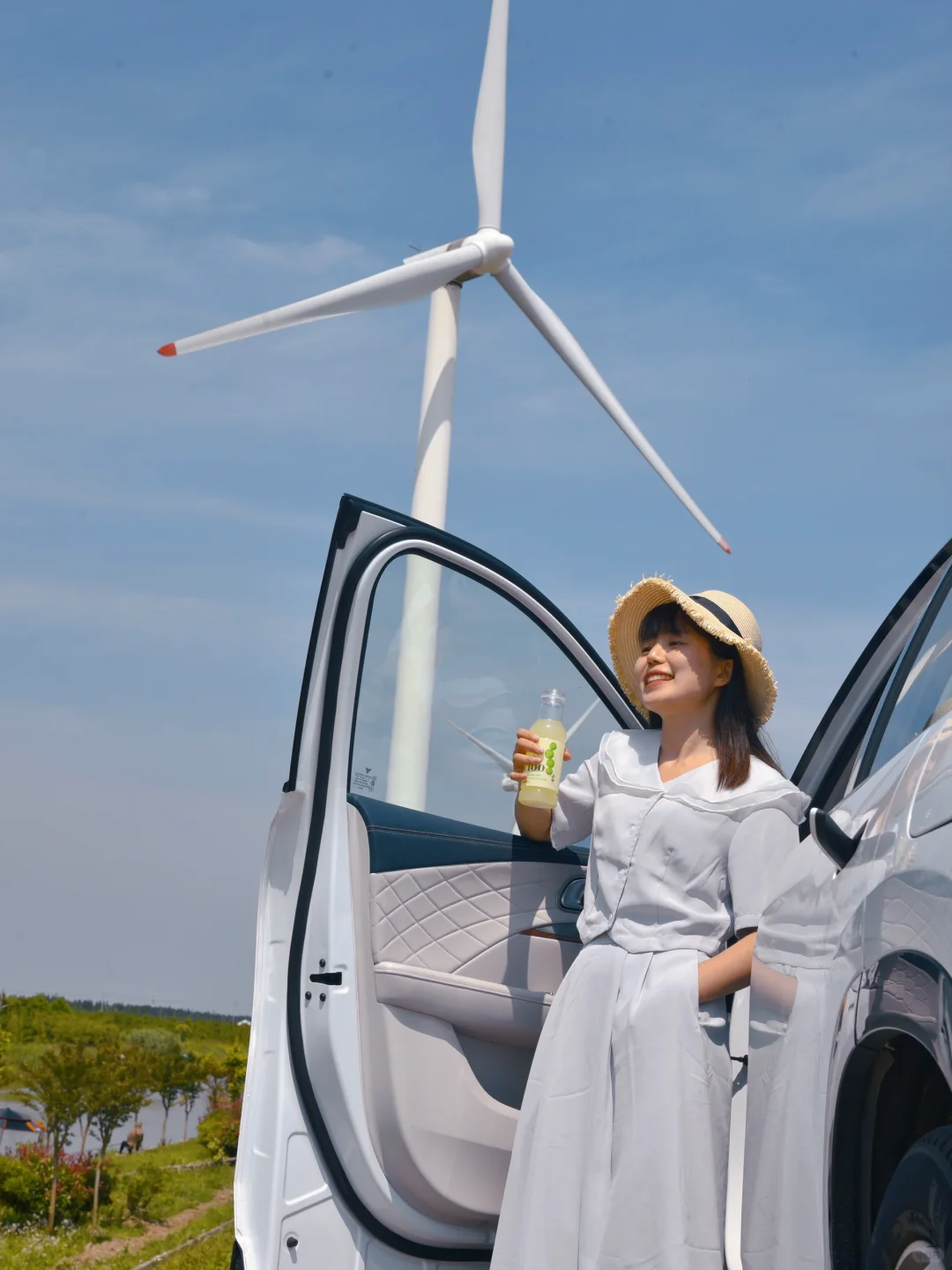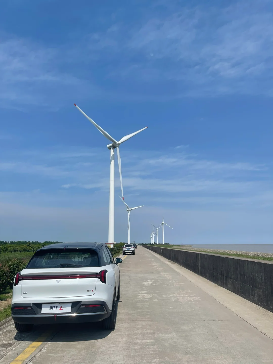 这边人超少,车是可以开到堤坝上的,我们端午期间去的,车也不多!可以拍到人+车+风车同框!