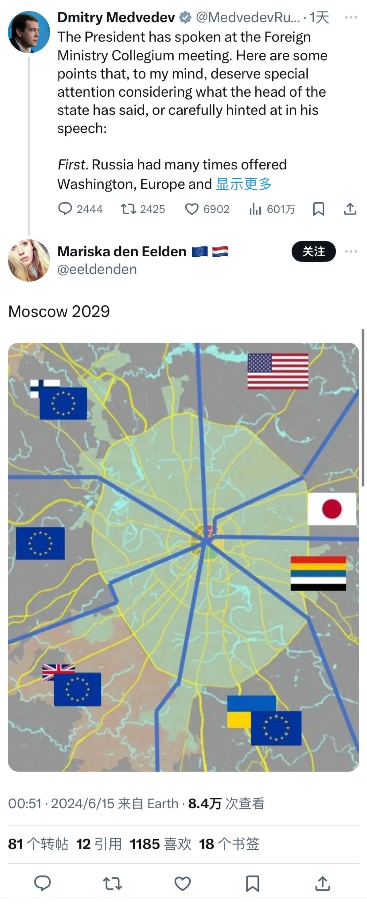 一位挂着欧盟和荷兰国旗的网民贴出了一张图,描绘了2029年的莫斯科。2029年的莫斯科被七家分治[捂脸](这位网民把文字和图片,发在了梅德韦杰夫的评论区。)
