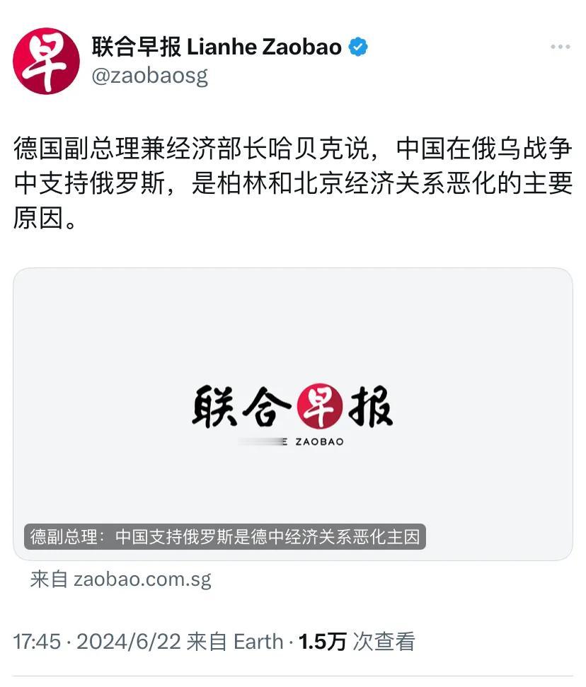 新加坡联合早报今天(6月22日)报道:“德国副总理兼经济部长哈贝克说,中国在俄乌战争中支持俄罗斯,是柏林和北京经济关系恶化的主要原因。”
