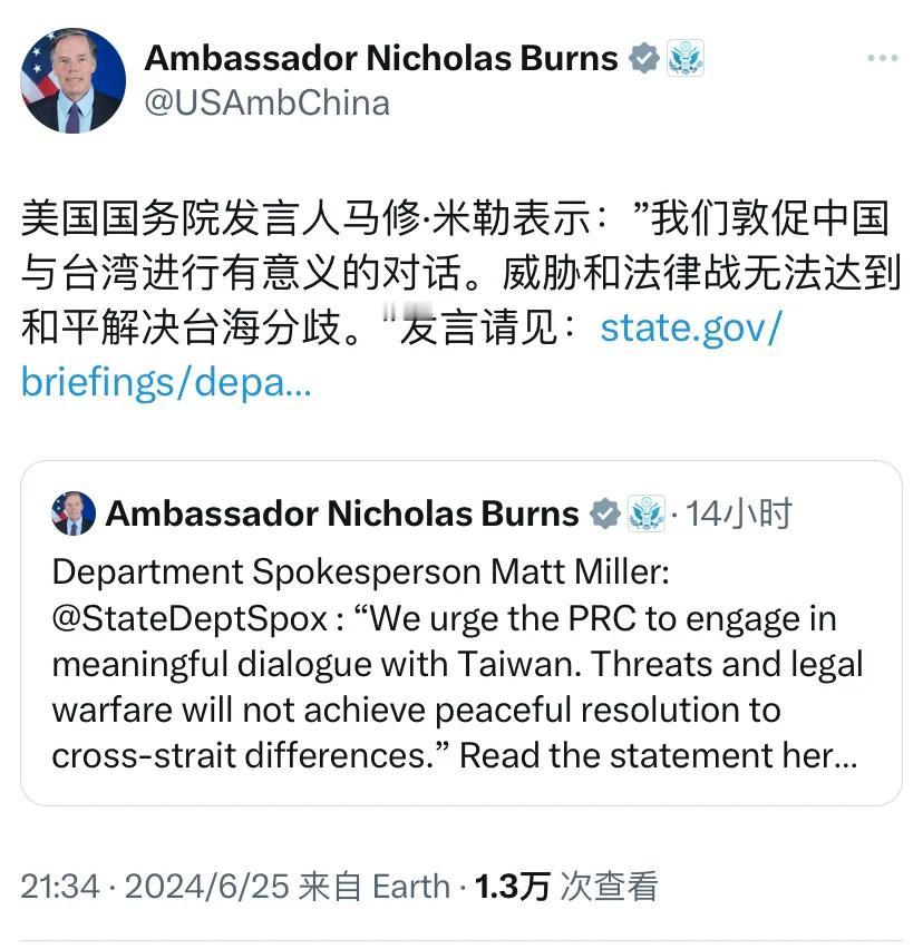 美国驻华大使伯恩斯昨晚(6月25日晚)写道:“美国国务院发言人马修·米勒表示:‘我们敦促中国与台湾进行有意义的对话。威胁和法律战无法达到和平解决台海分歧。’”