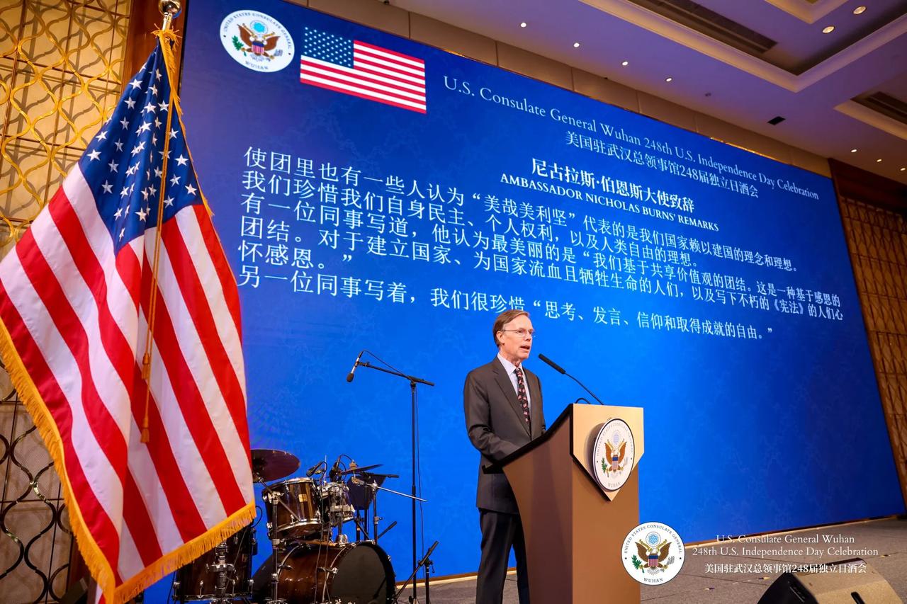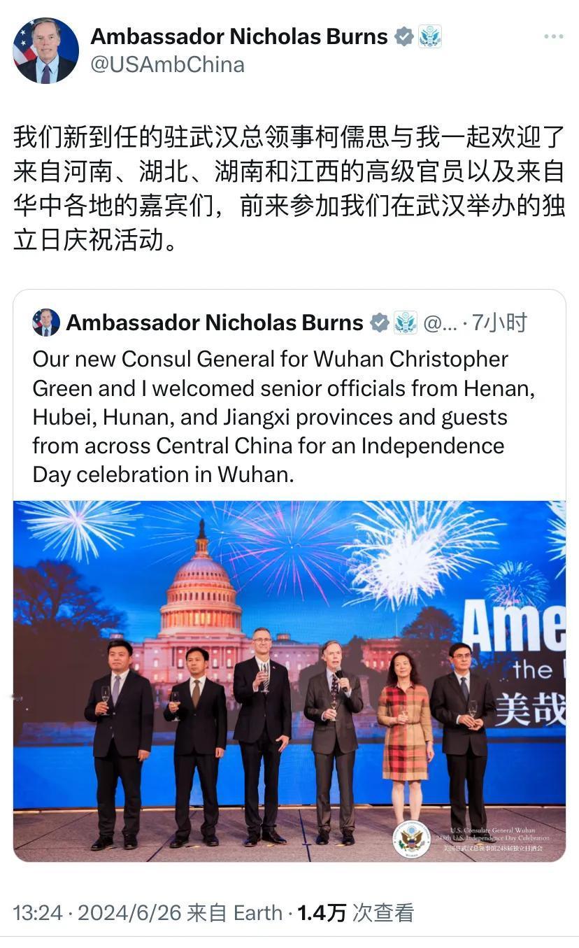 美国驻华大使伯恩斯和美国驻武汉总领事柯儒思今天(6月26日)在美国驻武汉总领事馆举办了名为“美哉美利坚”的“美国驻武汉总领事馆第248届独立日庆祝酒会”。伯恩斯指出,华中地区的高级官员(可能是华中四省外事部门负责人)出席了此次庆祝活动。从伯恩斯发布的活动照片中可以看出,中方官员神色凝重,不露笑容。这也许是当前中美关系的某种写照,虽然双方存在互动和交流,但要实现双方都开心愉快的局面,仍然面临诸多困难。
