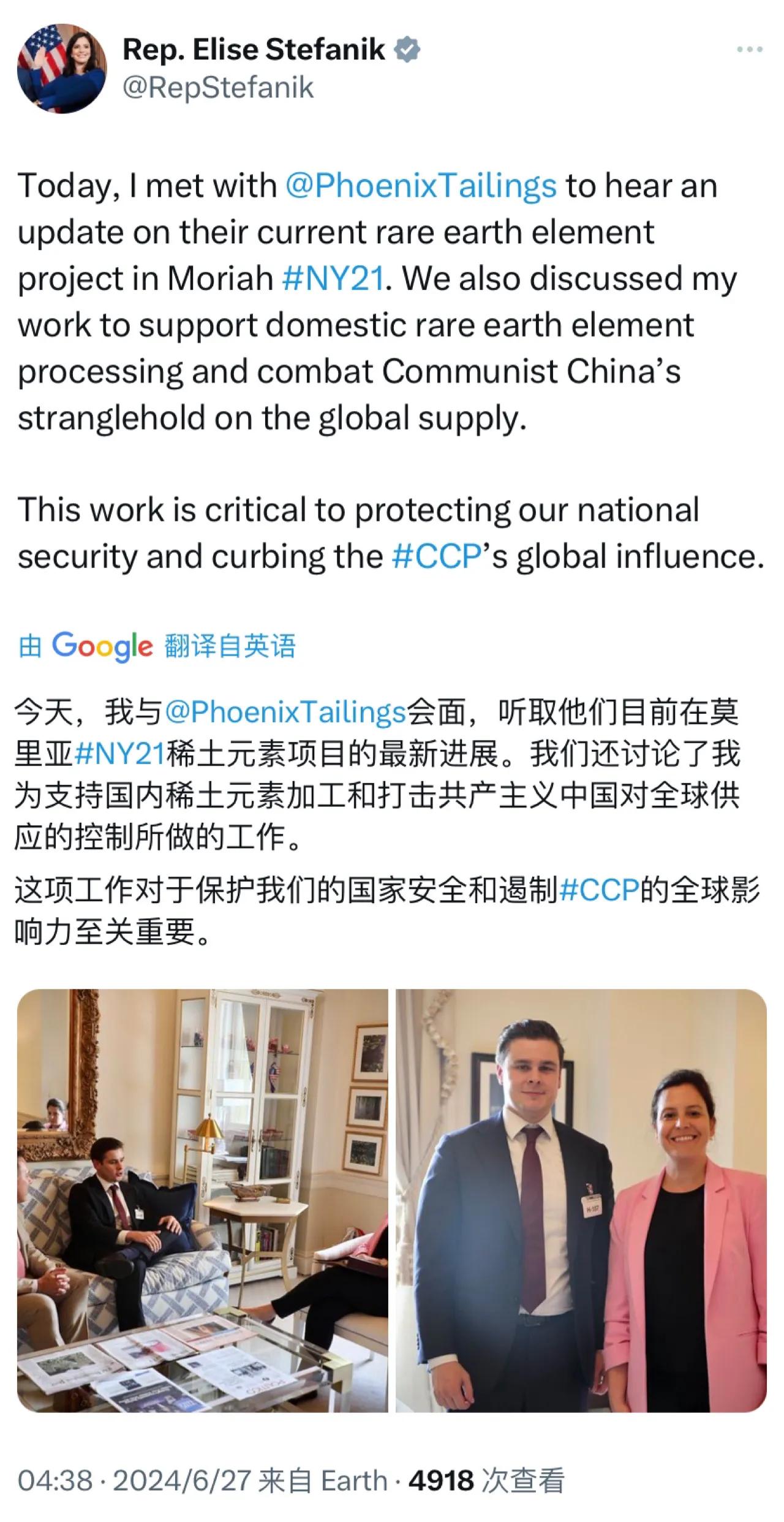 美国共和党籍众议员埃莉斯·斯蒂芬尼克今天(北京时间6月27日)叫嚣道:“今天,我与美国采矿与金属生产公司会面,听取他们目前在纽约州莫里亚市的稀土元素项目的最新进展。我们还讨论了我支持国内稀土元素加工和打击共产主义中国对全球供应的控制的工作。这项工作对于保护我们的国家安全和遏制中共的全球影响力至关重要。”
