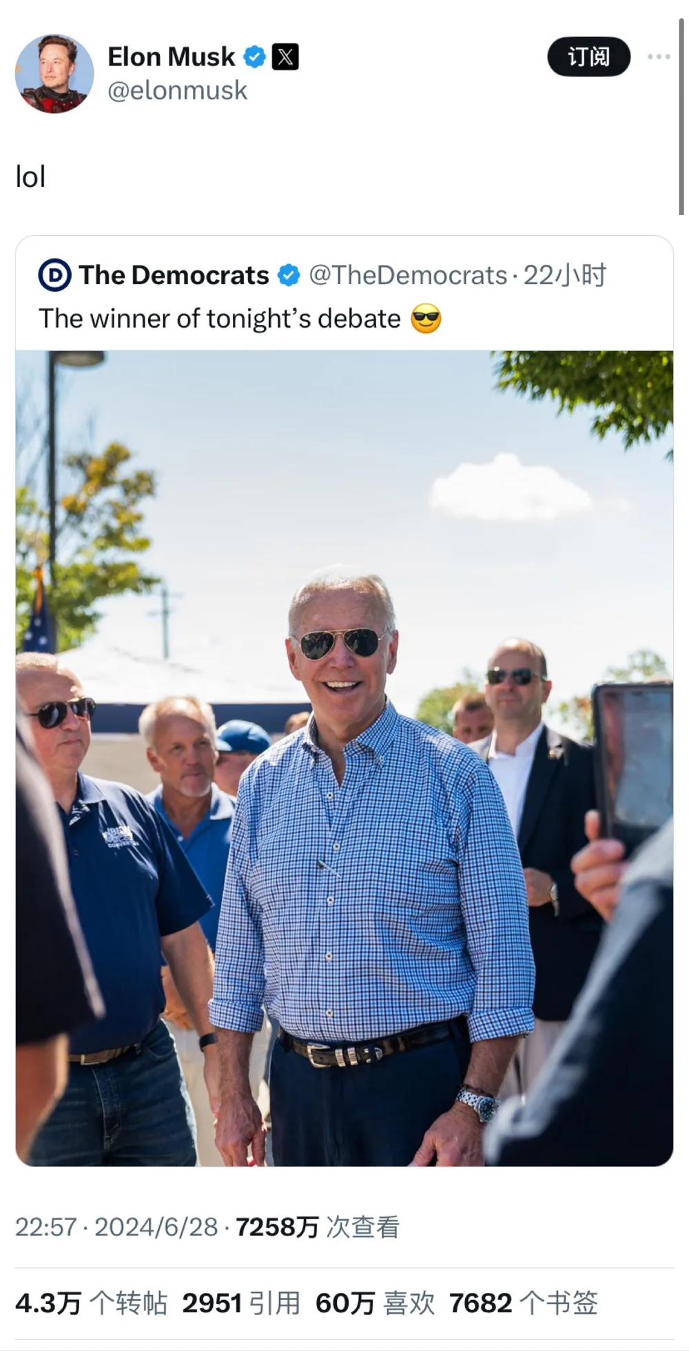 民主党官方账号昨天早些时候写道:“今晚辩论的获胜者😎”,并配上了一张拜登意气风发的照片。