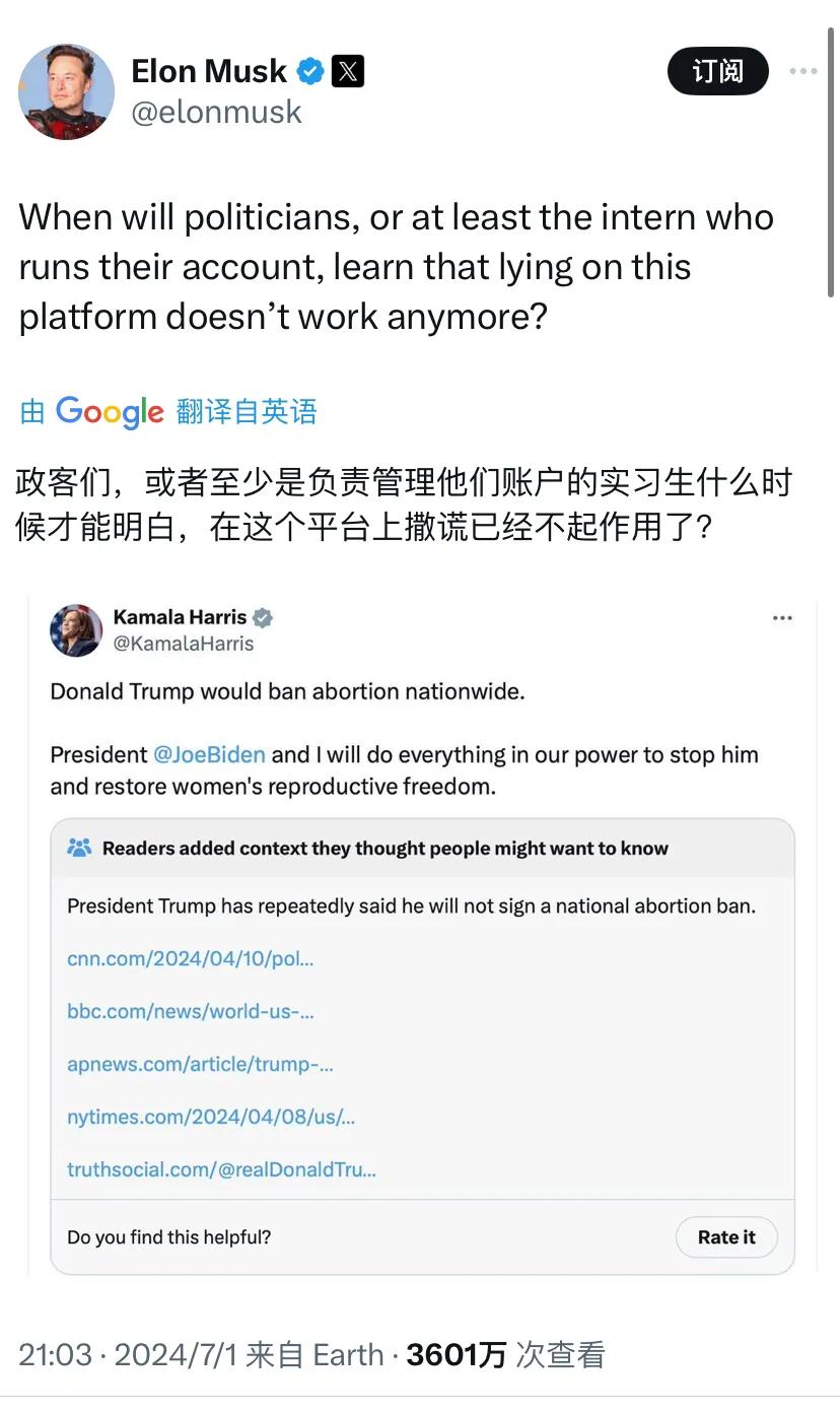 [机智]评几句:马斯克感觉已经彻底选边了,最近接连批评拜登和哈里斯。不过美国的政客,确实很喜欢玩弄“堕胎议题”。“堕胎议题”对于政治保守派、宗教保守派和年轻女性选民很敏感。