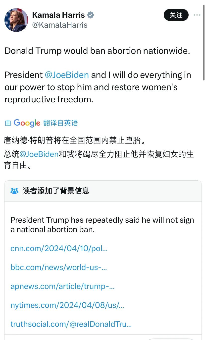 卡玛拉·哈里斯的账号此前写道:“特朗普将在全国范围内禁止堕胎。拜登总统和我将竭尽全力阻止他并恢复妇女的生育自由。”