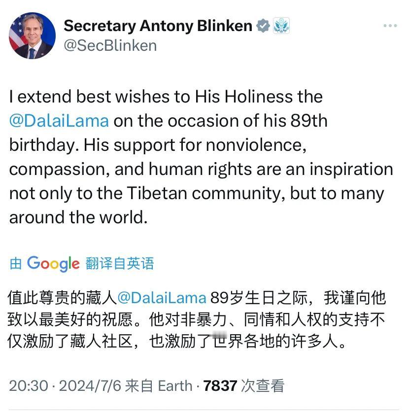 美国国务卿布林肯刚刚(北京时间20:30)祝福叛逃印度的达赖喇嘛89岁生日。布林肯写道:“他对非暴力、同情和人权的支持不仅激励了藏人社区,也激励了世界各地的许多人。”