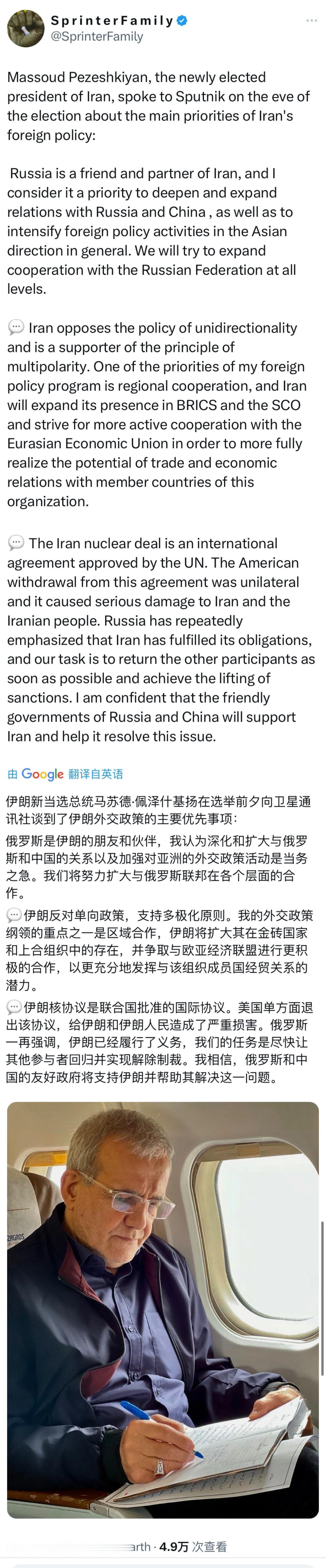 伊朗新总统佩泽什基安接受媒体采访时谈到了伊朗外交政策的主要优先事项: