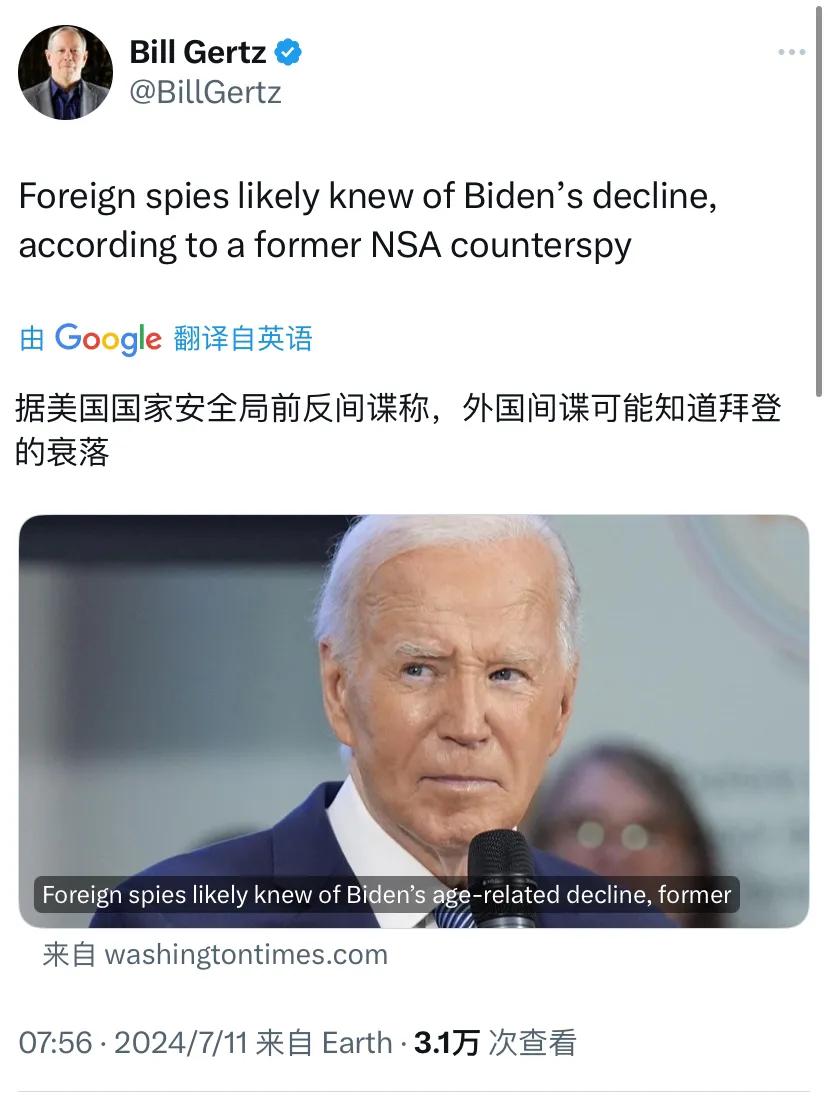 【比尔·格茨转发了自己发表在华盛顿时报的文章:前美国国家安全局反间谍人员称,外国间谍可能知道拜登因年龄增长而衰退。中国、俄罗斯和伊朗的情报人员瞄准了白宫有关拜登总统健康状况的机密,并可能向其政府通报了拜登总统精神敏锐度明显下降的情况。】