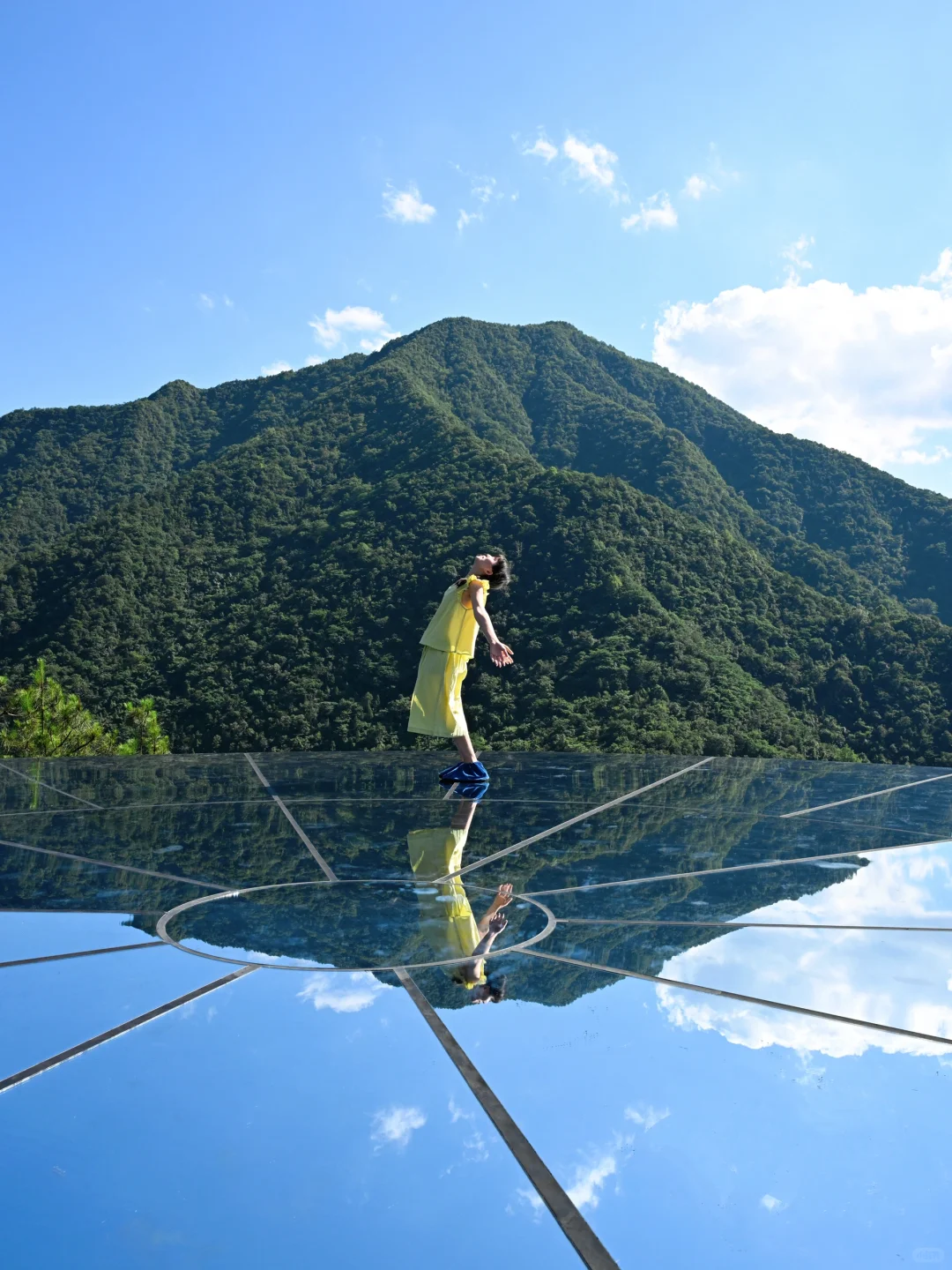 需要穿鞋套上去,顶层是一面巨大的镜子,可以拍到山的倒影,非常好看