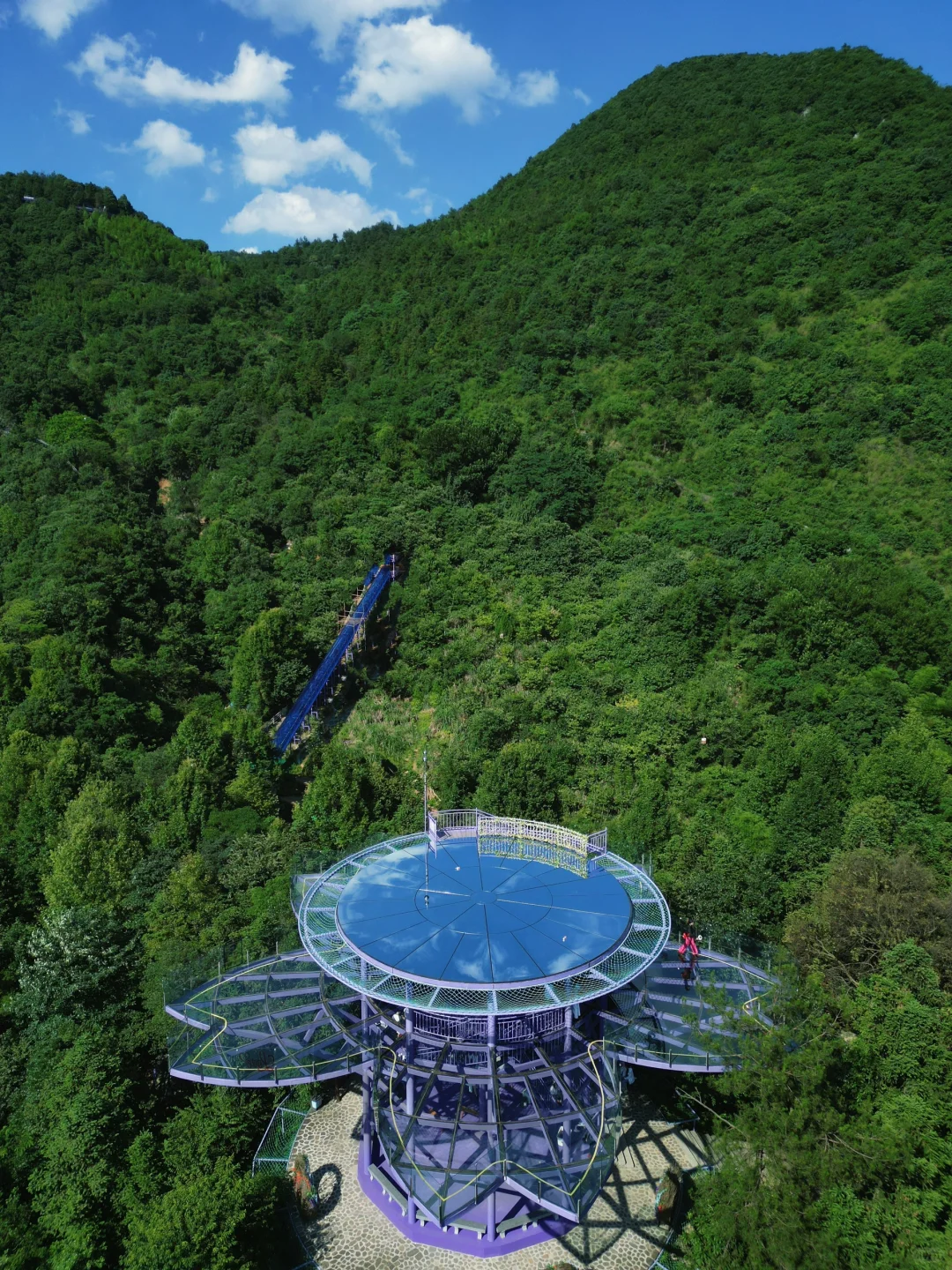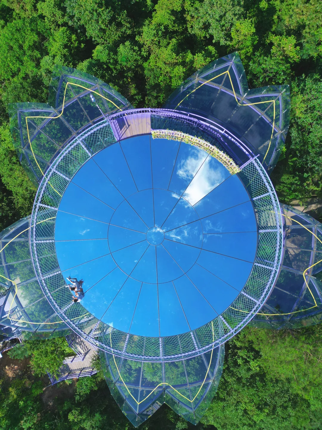 两条并行的天梯,一条适合喜欢刺激的人走,有安全绳,脚下是玻璃和悬崖