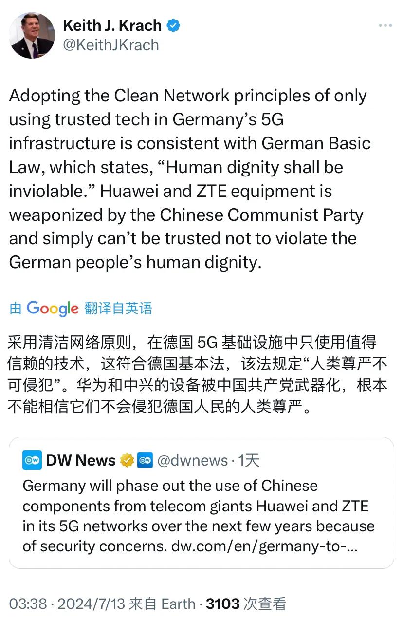【基思·克拉奇转发了德国之声的报道:出于安全考虑,德国将在未来几年逐步停止在其 5G 网络中使用来自中国电信巨头华为和中兴通讯的零部件。】