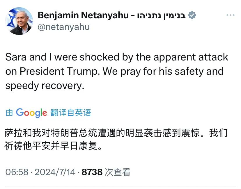 特朗普遭遇枪击后,以色列总理内塔尼亚胡第一时间发文写道:“萨拉和我对特朗普总统遭遇的明显袭击感到震惊。我们祈祷他平安并早日康复。”