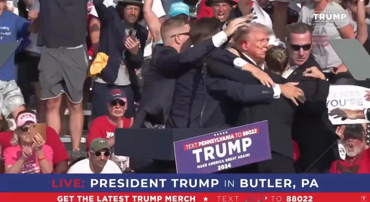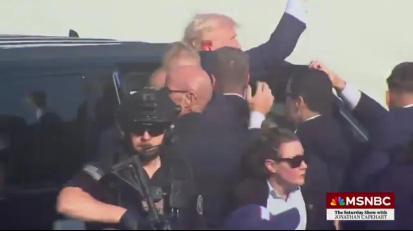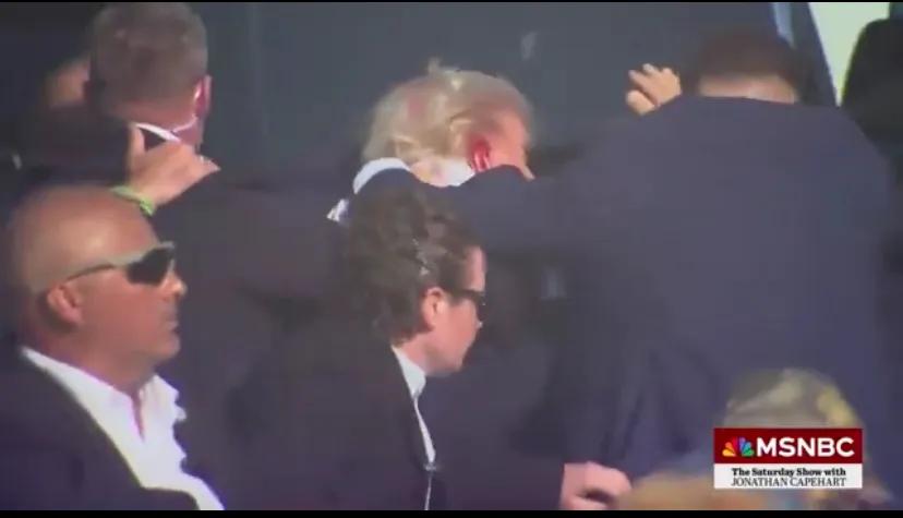 突发新闻:特朗普在宾夕法尼亚州集会上遭遇枪击,右耳有血,疑似子弹擦破了耳朵。人没事,被匆忙带离现场。