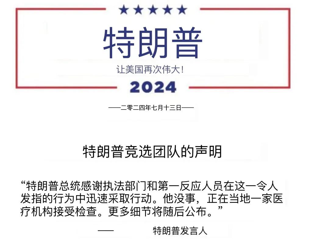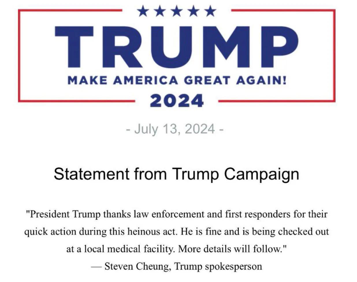 枪击案之后,特朗普竞选团队第一时间发布声明:“特朗普总统感谢执法部门和急救人员在这次令人发指的袭击中迅速采取行动。他目前状况良好,正在当地一家医疗机构接受检查。更多详情将陆续公布。”