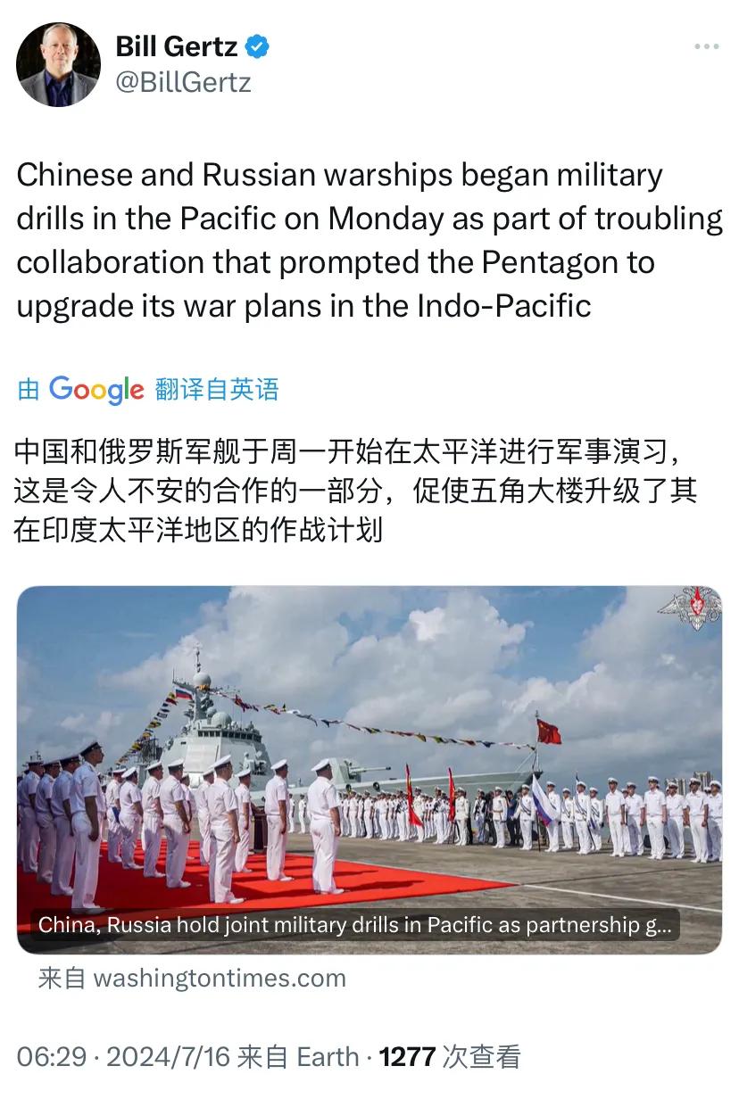 华盛顿时报顽固派反华记者比尔·格茨今天(北京时间7月16日)写道:“中国和俄罗斯军舰于周一开始在太平洋进行军事演习,这是令人不安的合作的一部分,促使五角大楼升级了其在印度太平洋地区的作战计划。”
