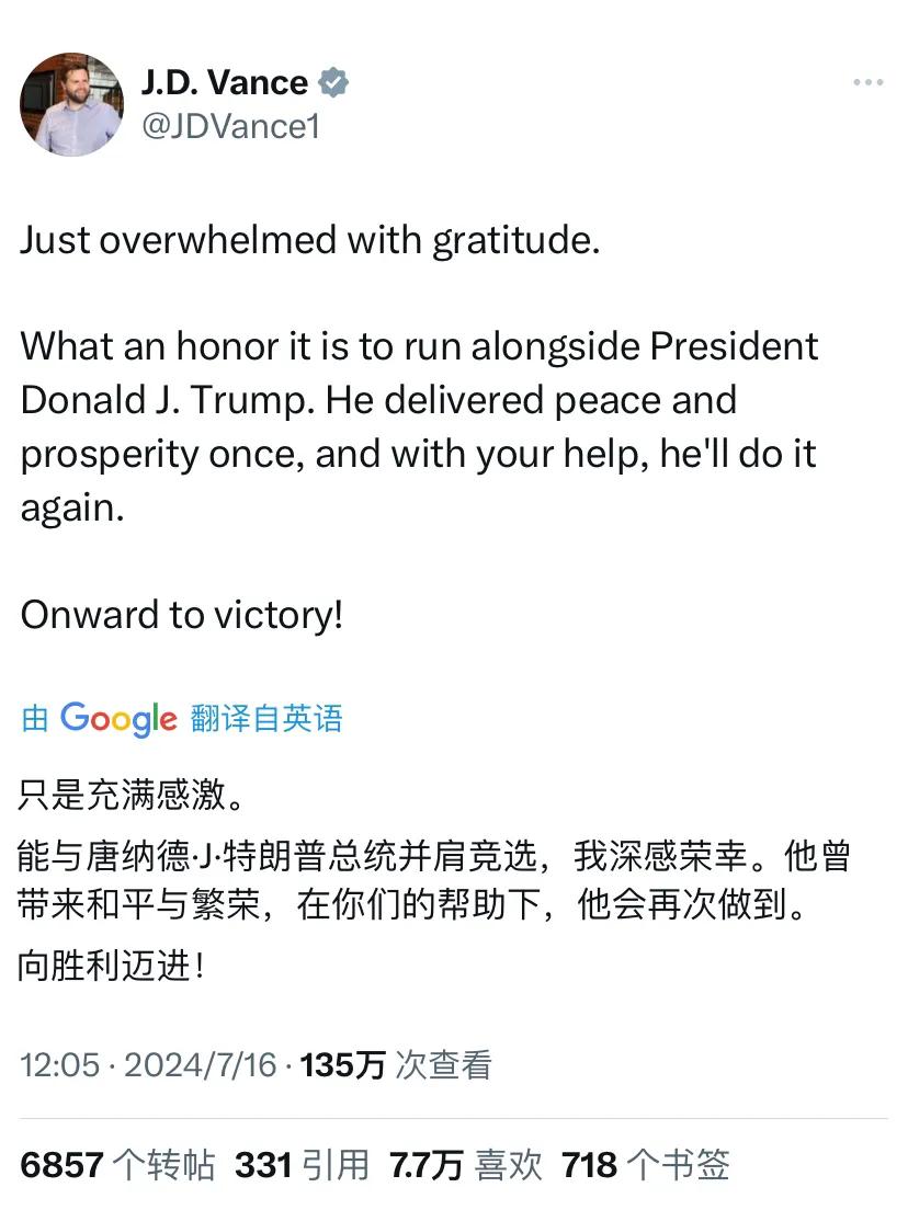 美国共和党副总统候选人J.D.万斯刚刚(北京时间7月16日12:05)写道:“只是充满感激。