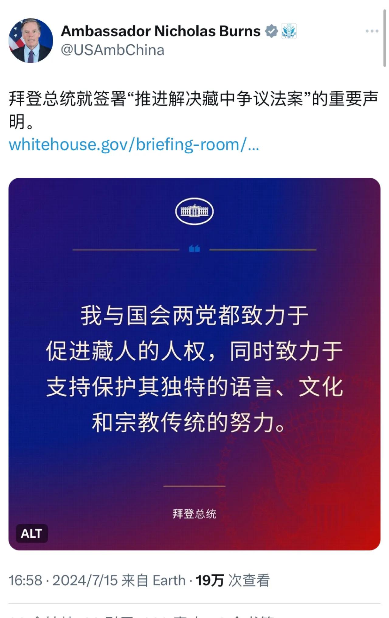 美国驻华大使伯恩斯昨天(7月15日)写道:“拜登总统就签署‘推进解决藏中争议法案’的重要声明。拜登:‘我与国会两党都致力于促进藏人的人权,同时致力于支持保护其独特的语言、文化和宗教传统的努力’”