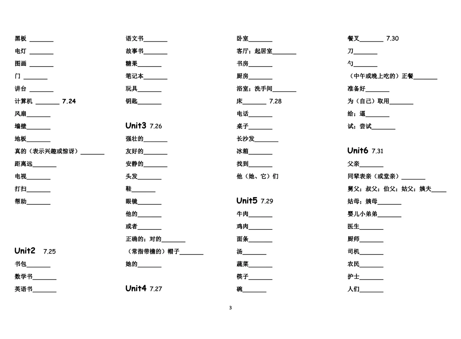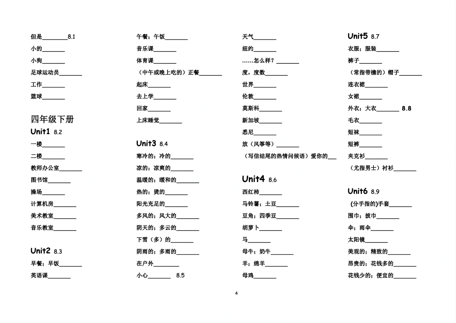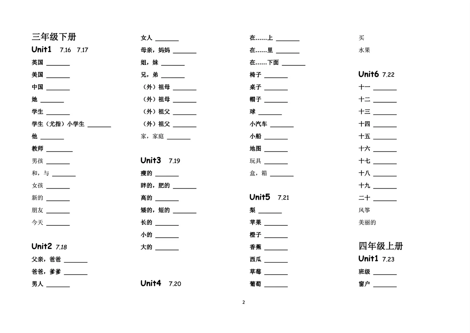 三年级四年级英语黑体字单词默写表