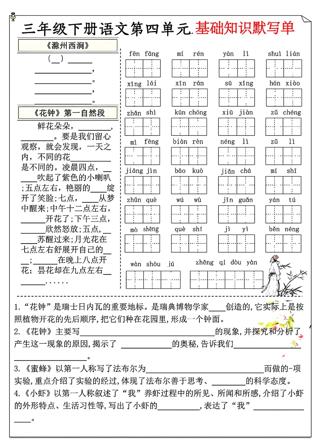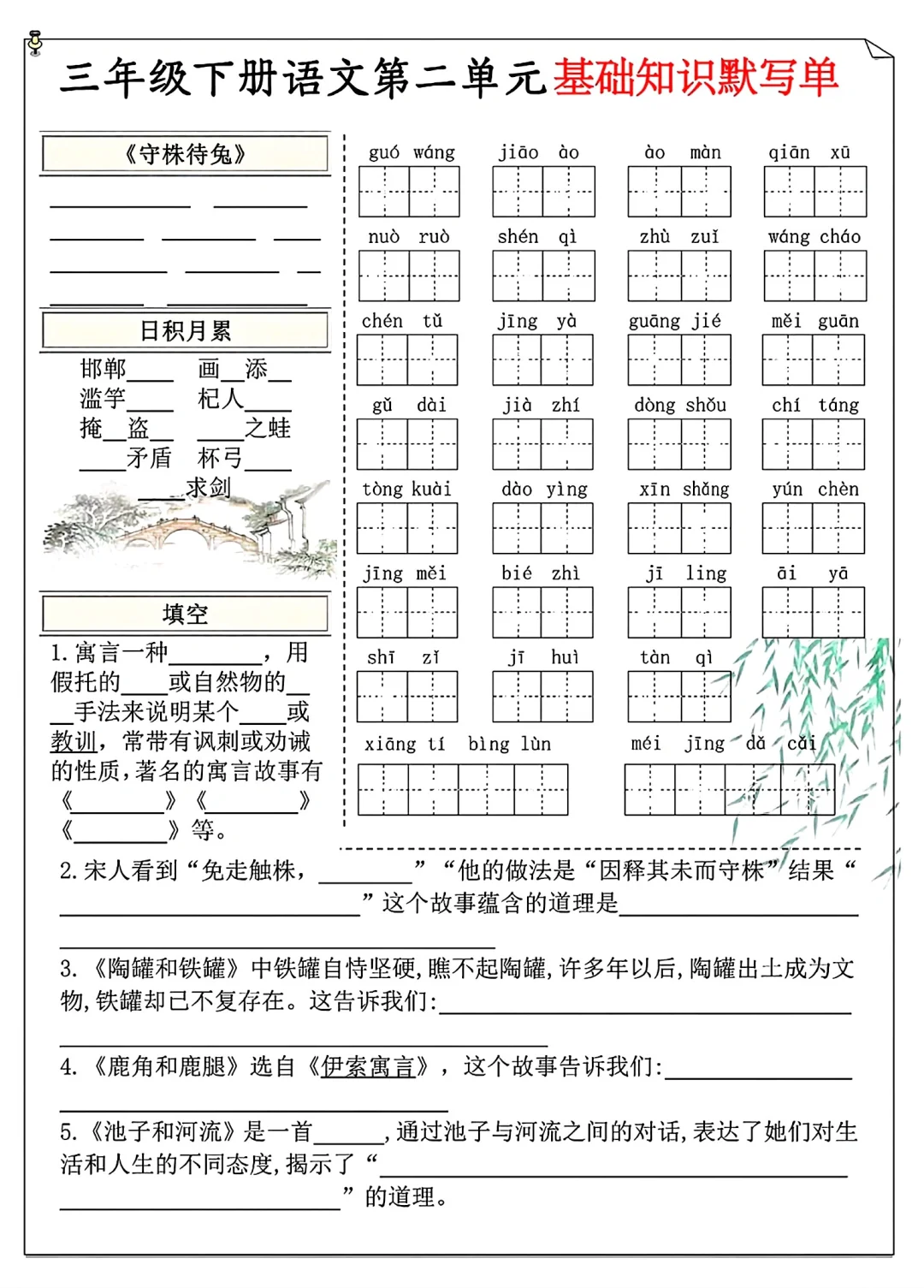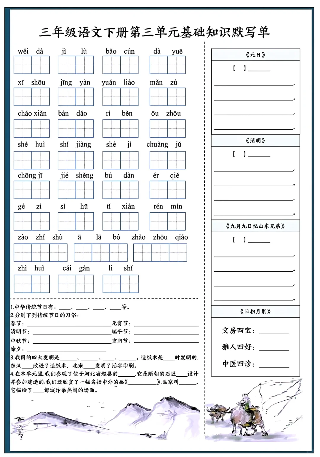 三年级下册语文1~8元单元基础默写单,这个没答案,随机配点有答案试卷