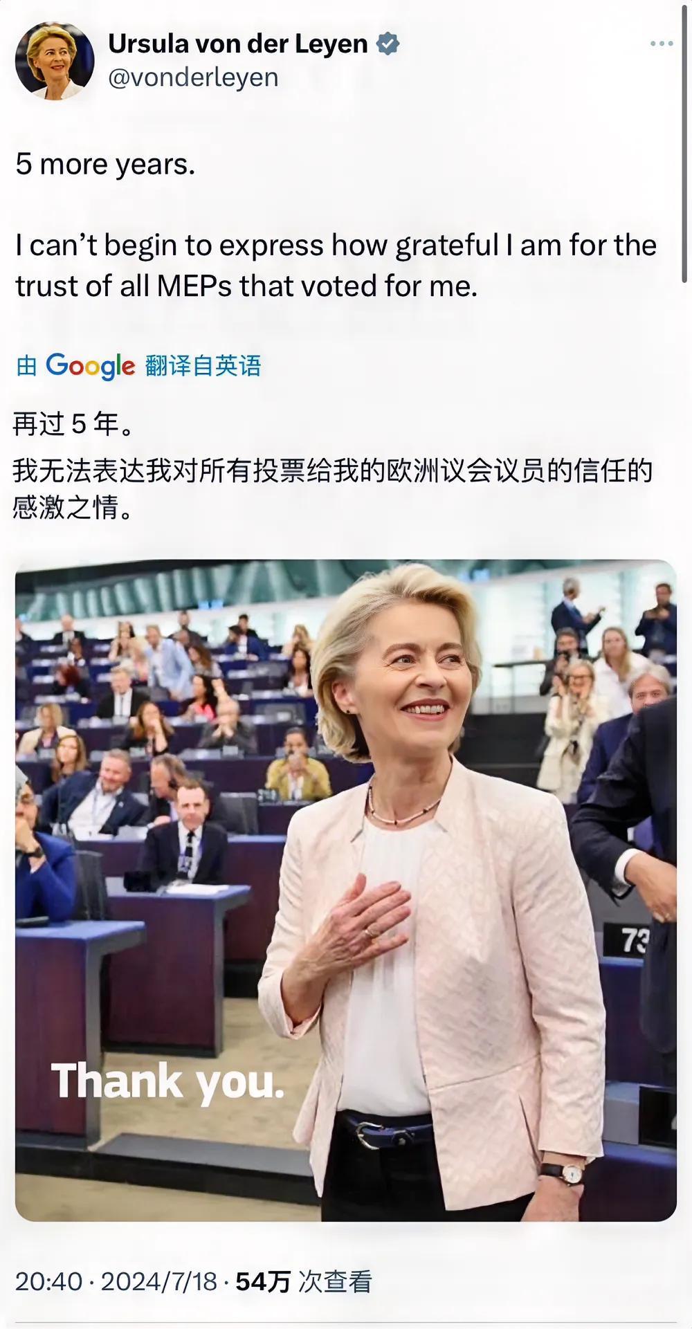 成功连任欧盟委员会主席后,冯德莱恩今晚(北京时间7月18日晚)发文写道:“新的5 年。我无法表达我对所有投票给我的欧洲议会议员的信任的感激之情。”