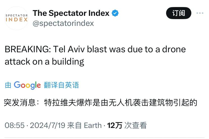 北京时间7月19日8:55:特拉维夫爆炸是由无人机袭击建筑物引起的。