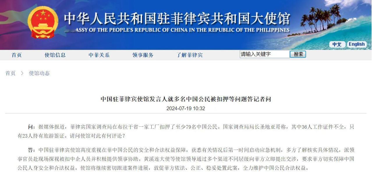 新加坡联合早报今天(7月19日)报道:“菲律宾政府据报在当地一家工厂扣押了至少79名中国公民,中国驻菲律宾使馆表示,中方已向菲方提出交涉,促菲方依法公正处置此案。”(中国驻菲律宾大使馆的官方回应见图二)