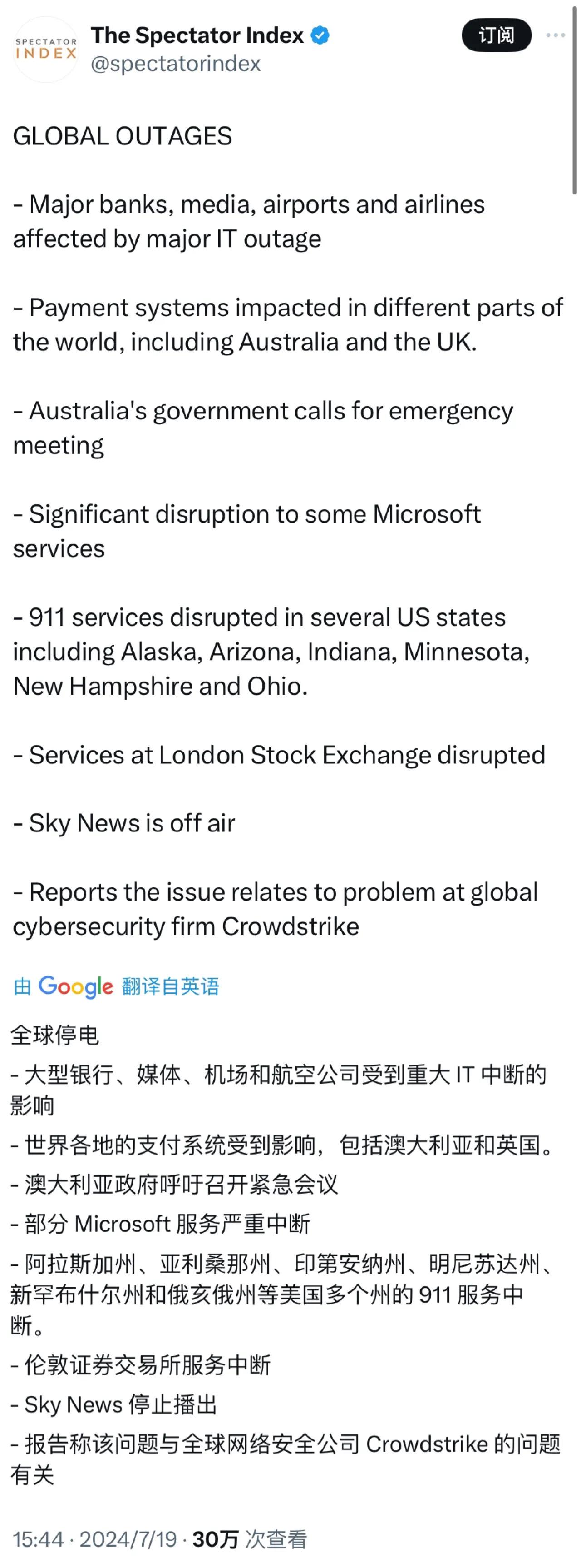 网络安全平台CrowdStrike在全球范围内“宕机”,导致一系列突发状况: