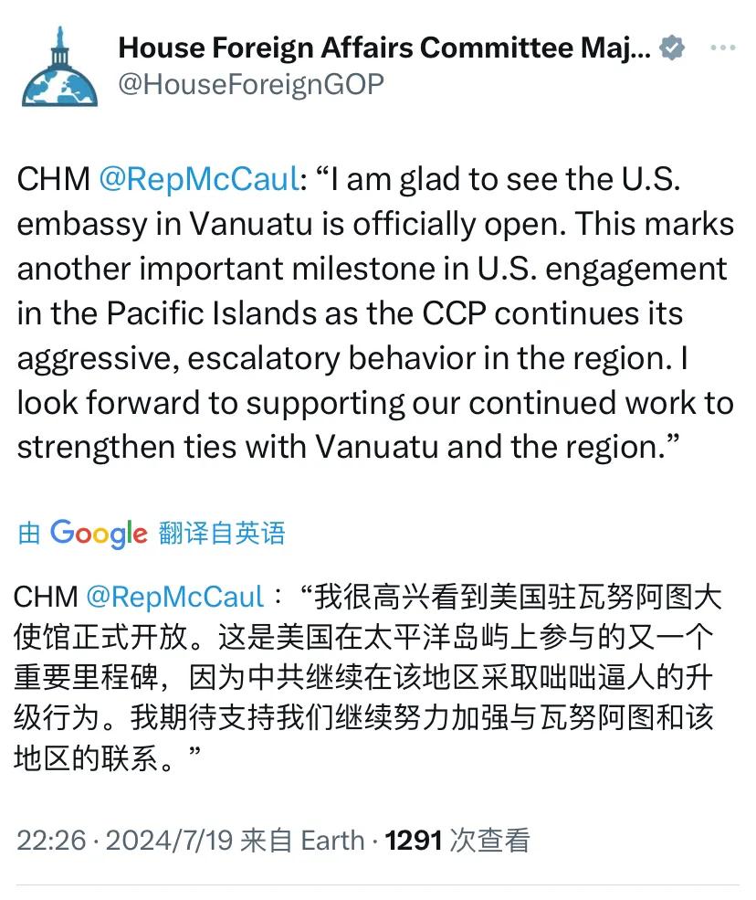 美国国会众议院外交委员会昨晚(北京时间7月19日晚)写道:“外交委员会主席迈考尔:‘我很高兴看到美国驻瓦努阿图大使馆正式开放。这是美国在太平洋岛屿上参与的又一个重要里程碑,因为中共继续在该地区采取咄咄逼人的升级行为。我期待支持我们继续努力加强与瓦努阿图和该地区的联系。’”