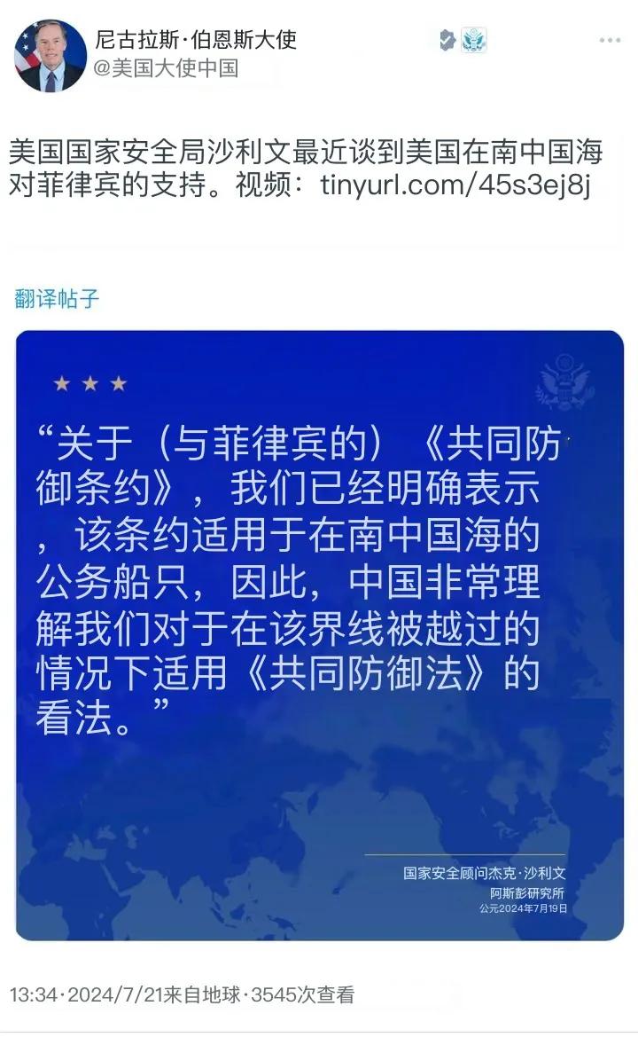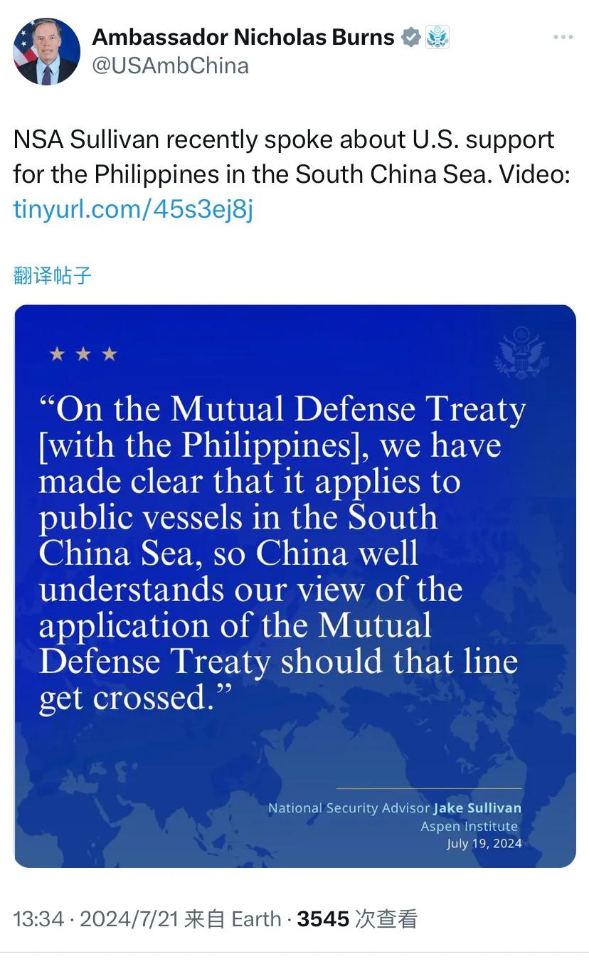 美国驻华大使伯恩斯今天(7月21日)写道:“美国国家安全顾问沙利文最近谈到美国在南中国海对菲律宾的支持。”