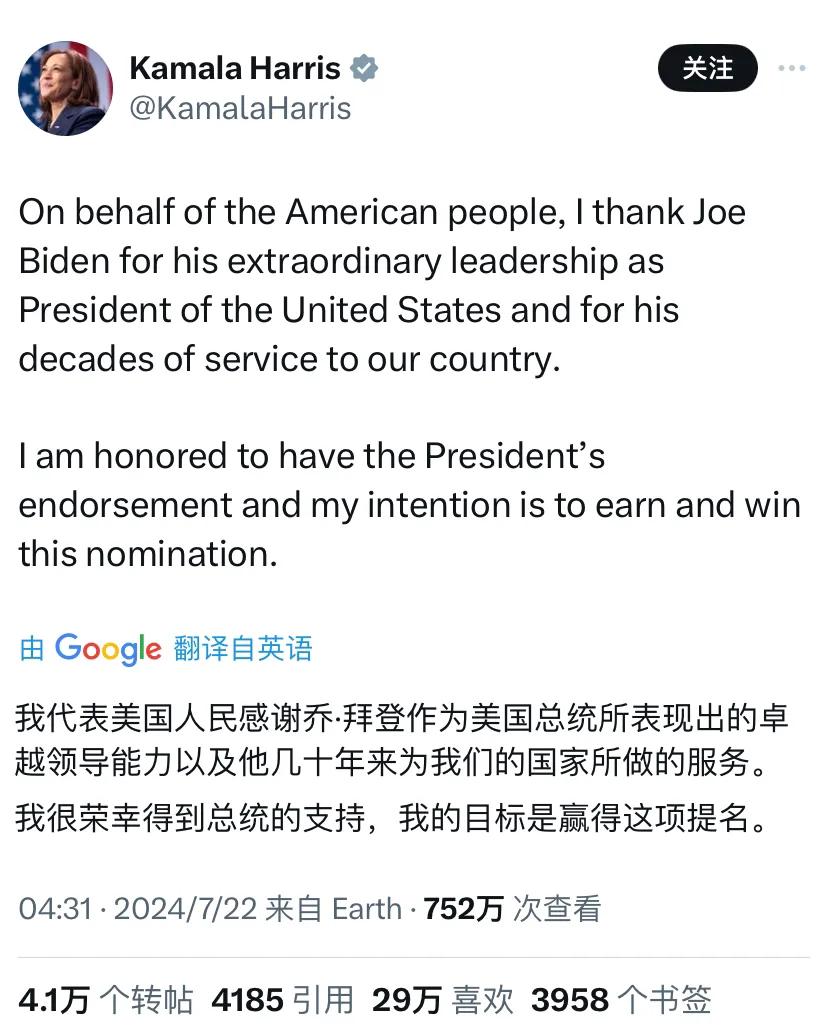 拜登宣布退选后,美国副总统哈里斯今天(北京时间7月22日)写道:“我代表美国人民感谢乔·拜登作为美国总统所表现出的卓越领导能力以及他几十年来为我们的国家所做的服务。我很荣幸得到总统的支持,我的目标是赢得这项提名。”